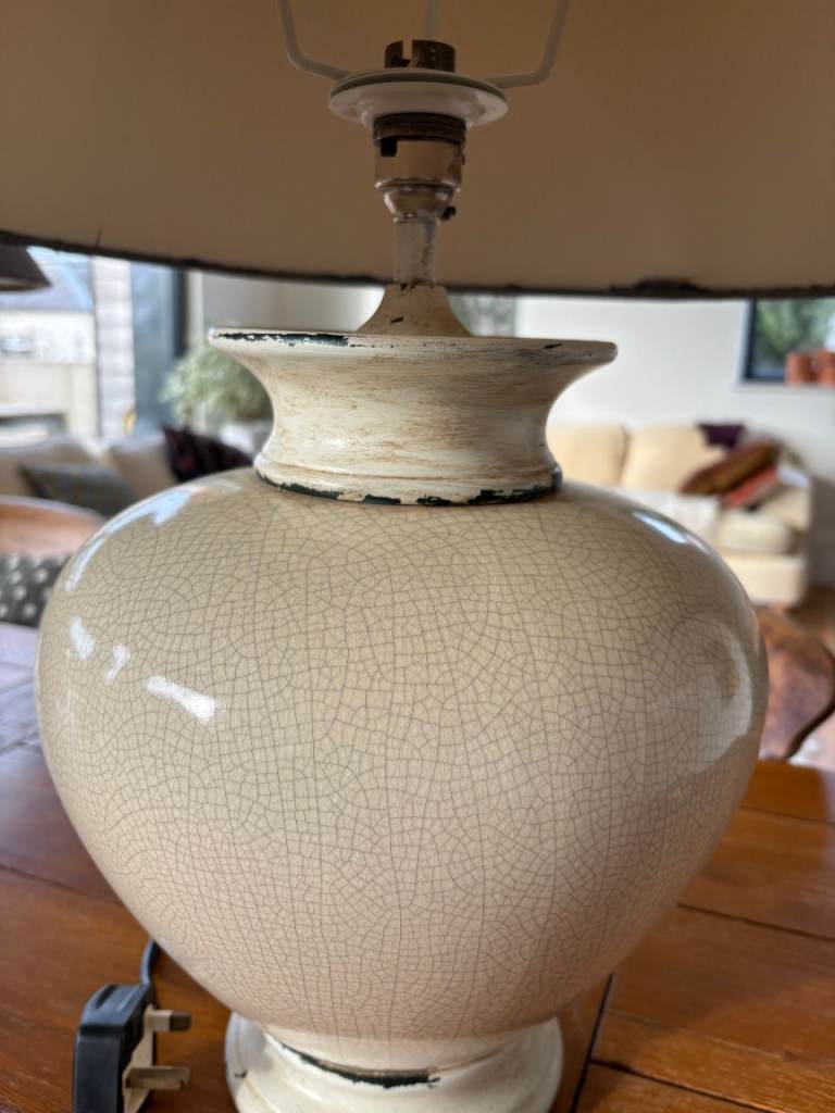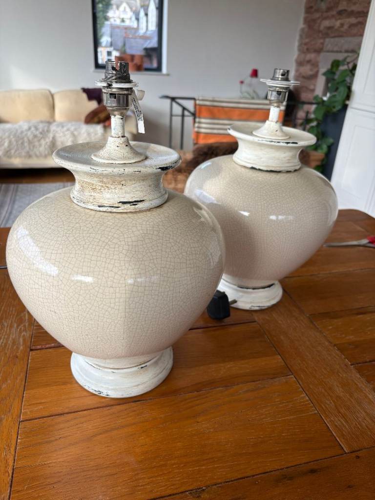 They are cracked glaze in cream with pale grey cracking. Shades are from John Lewis. All in excellent order. Very pretty and quite big. Very interior design and good looking. Measurements are approx as follows:
