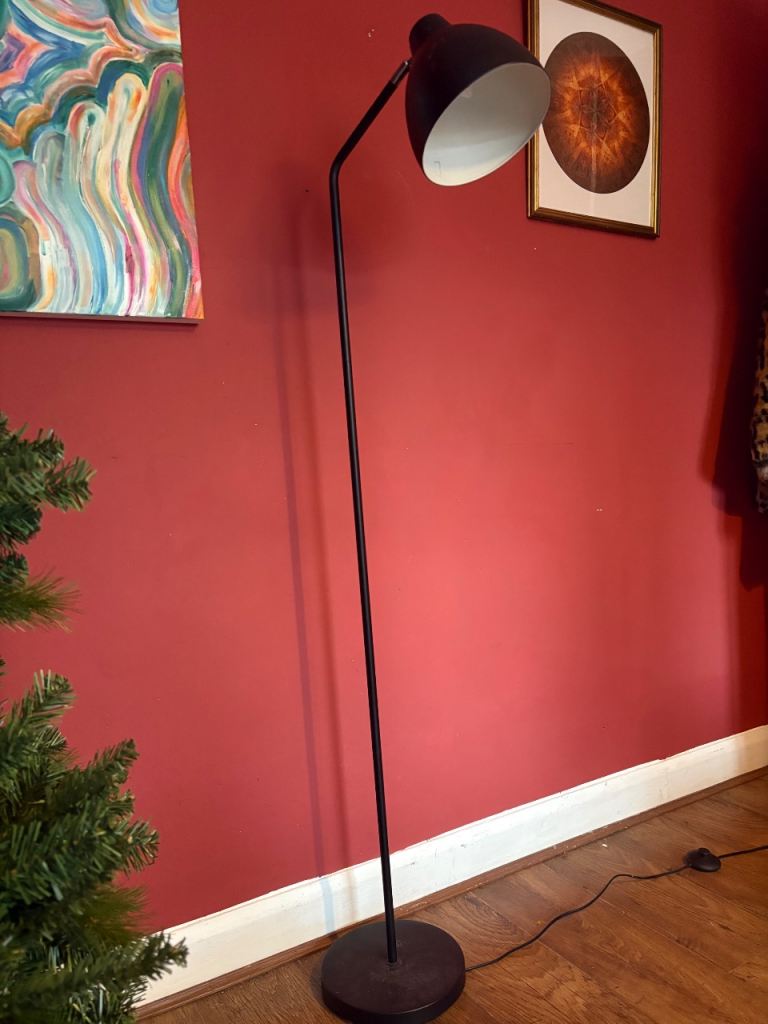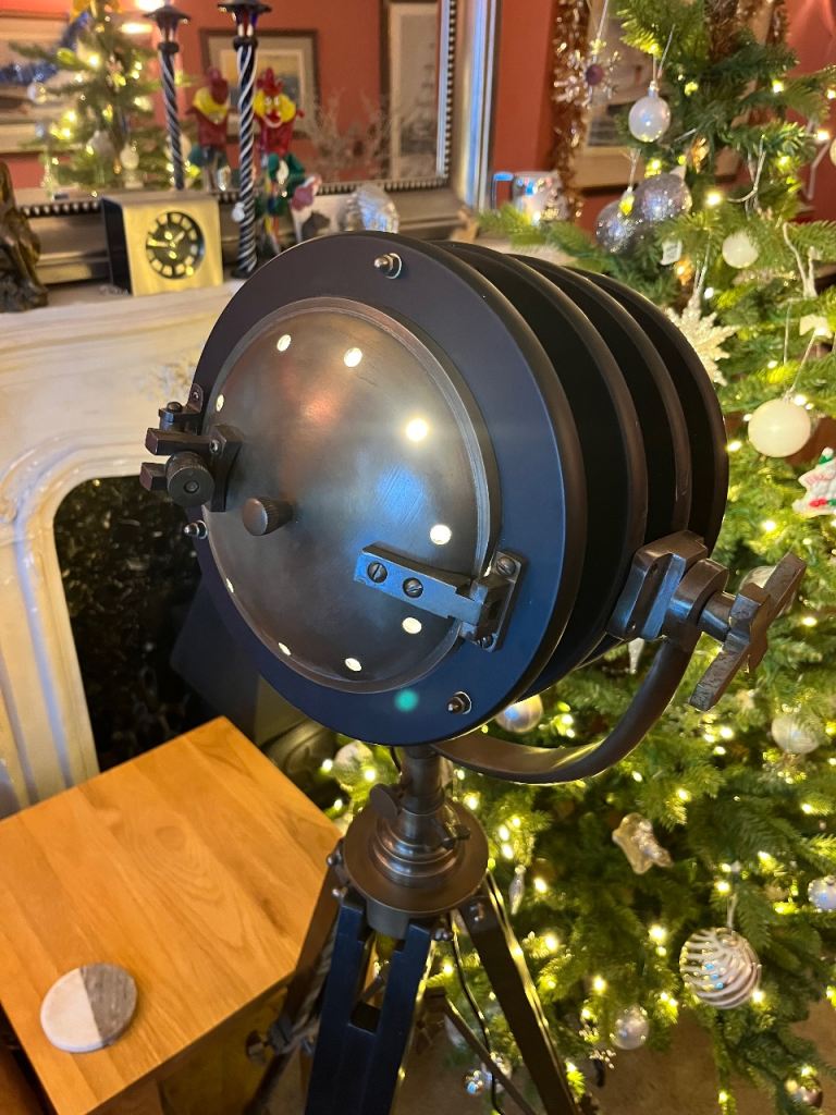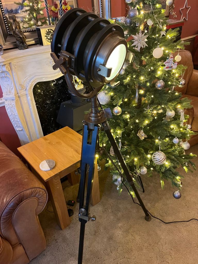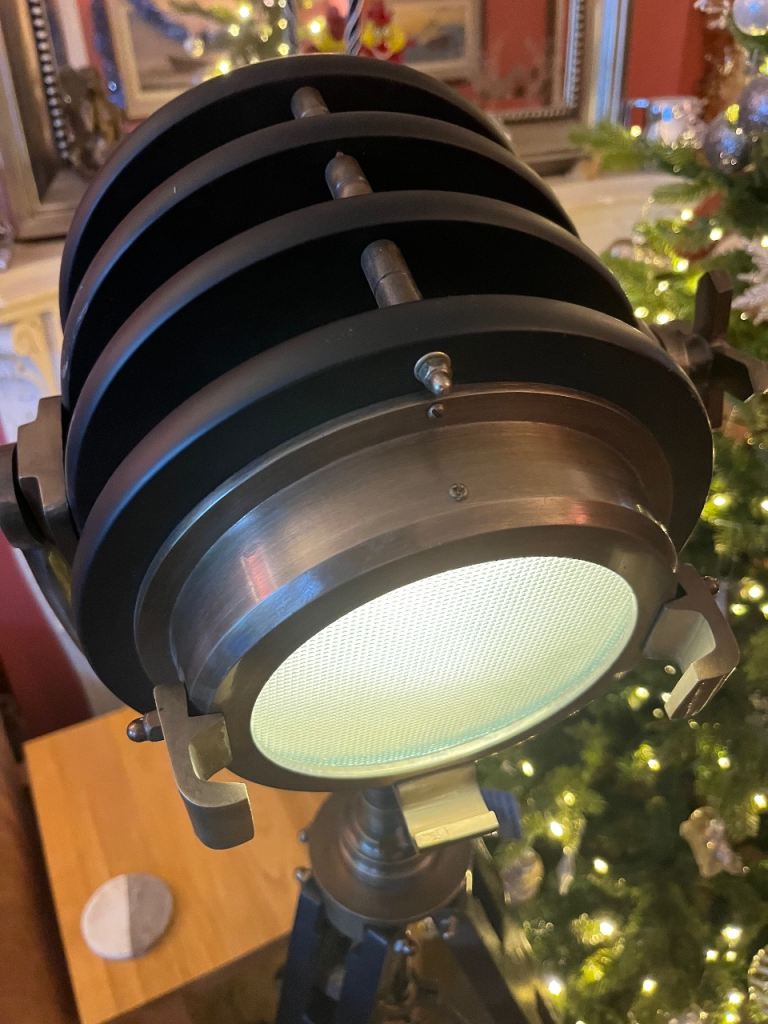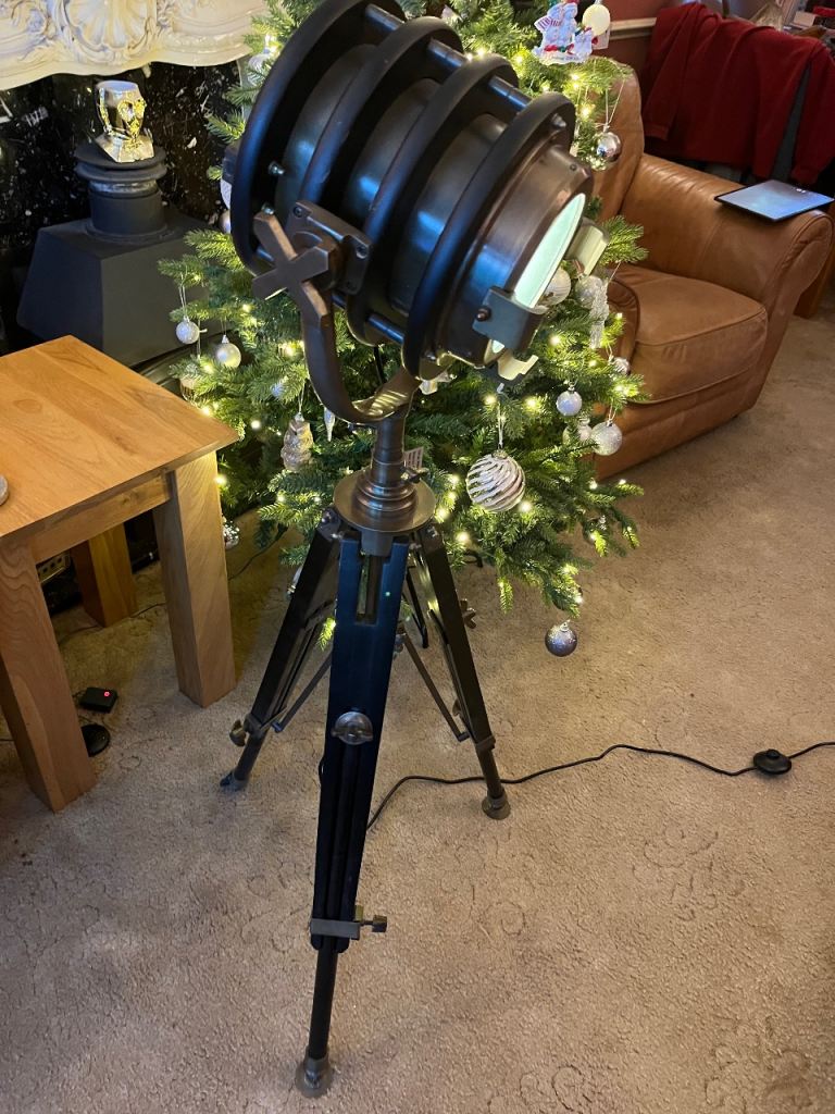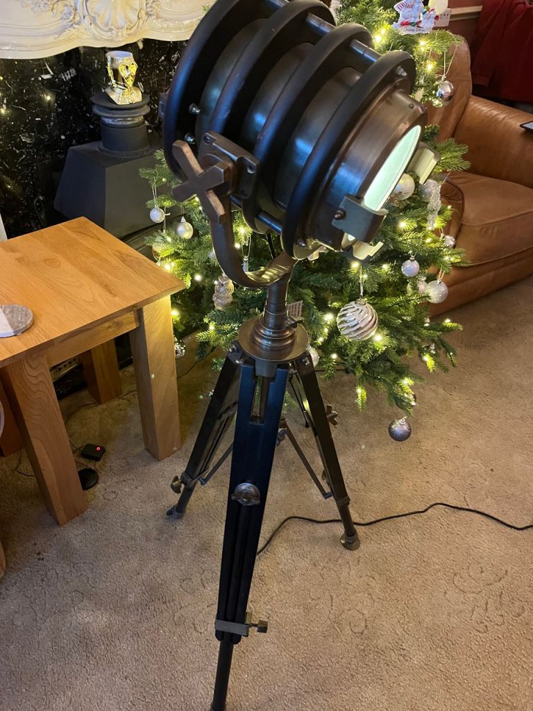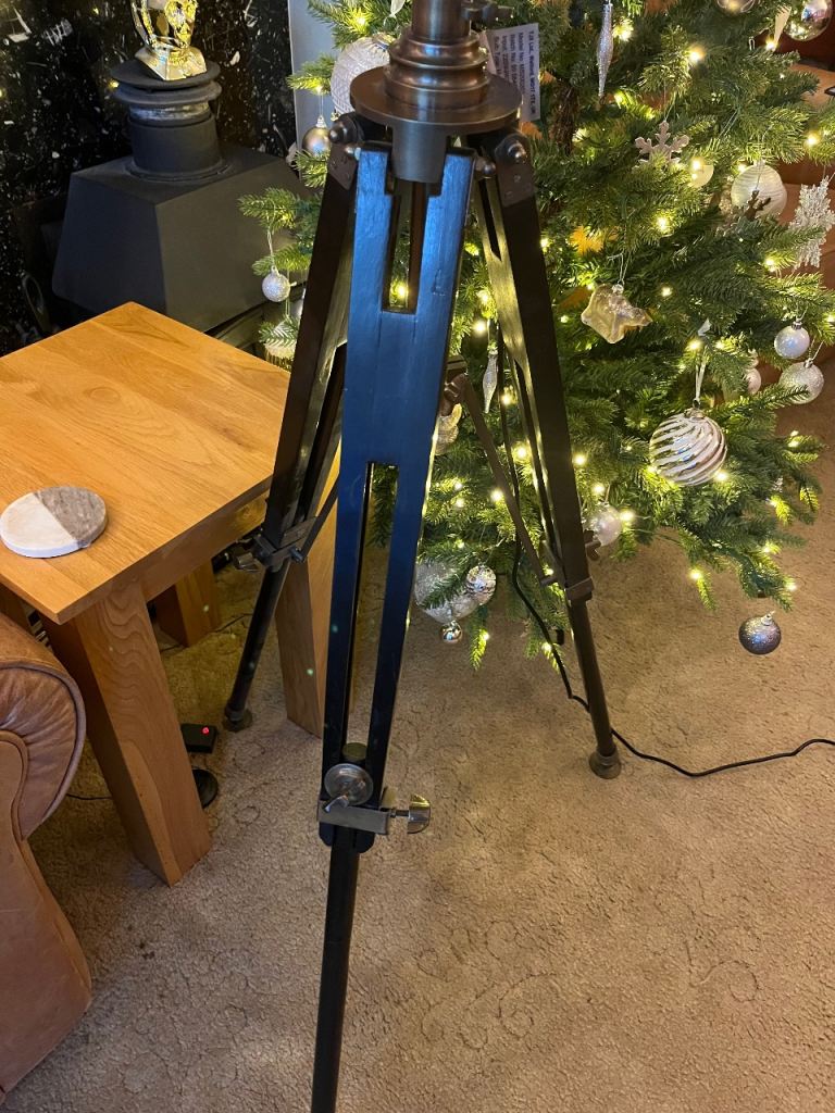 vintage style adjustable tripod floor lamp , fully adjustable in height and lamp head position with black wooden tripod. It comes with a foot operated on/off switch and led bulb, in great condition , would make a perfect Christmas present.