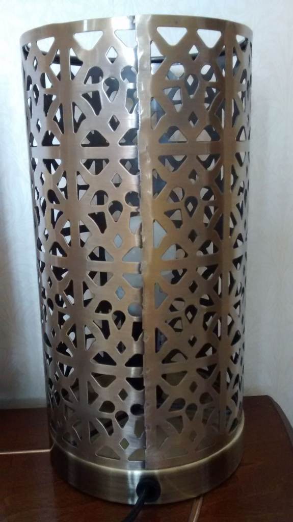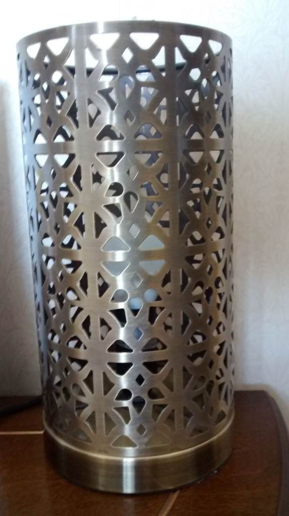 A beautiful cylindrical table lamp made in China for Wilko. Made of bronzy coloured metal with a delicate filigree cut out pattern.