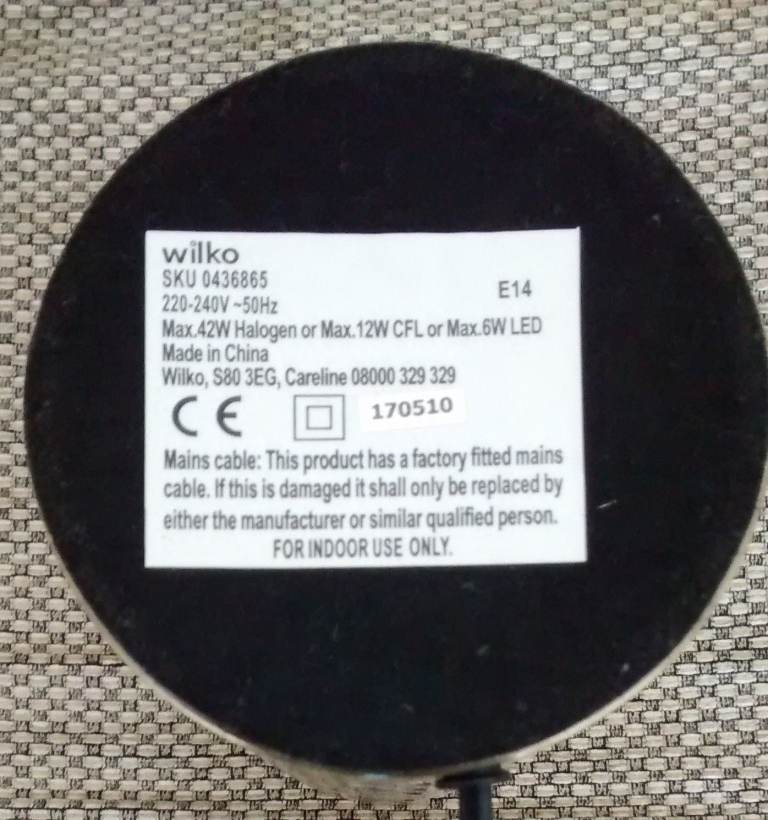 Bulb: 42W Halogen or 12W CFL or 6W LED screw fitting. Can be seen working. (Comes complete with bulb.)