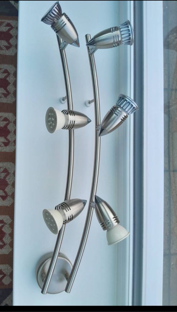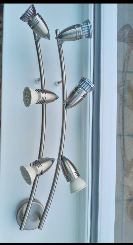 Silver strip ceiling lights with six spot lamp holders. Great condition- as new.