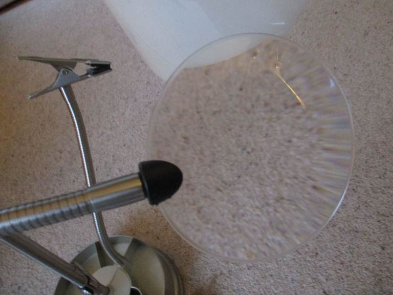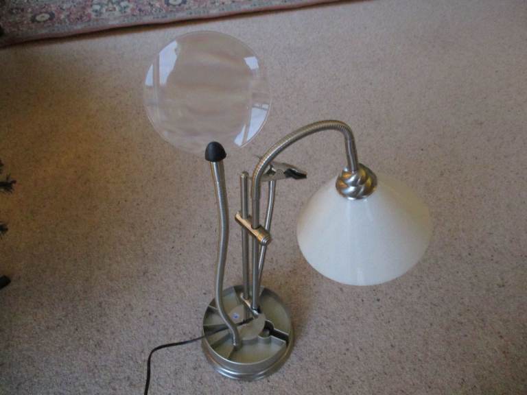 A large desk lamp suitable for intricate craft work/needlework/repair work/reading small print etc on account of its magnifying lens and clamp. Very stable with a heavy 19cm diameter base. The lens is 13cm diameter and the clamp has a strong spring to grip whatever object is being worked on or to secure the whole lamp, for example, to a desk edge. The height of the lamp in normal working position is about 55cm, and all components move independently on flexible mounts. We are in Buchlyvie, 15 miles west of Stirling.