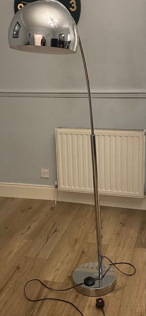 Modern, silver coloured curved floor lamp.