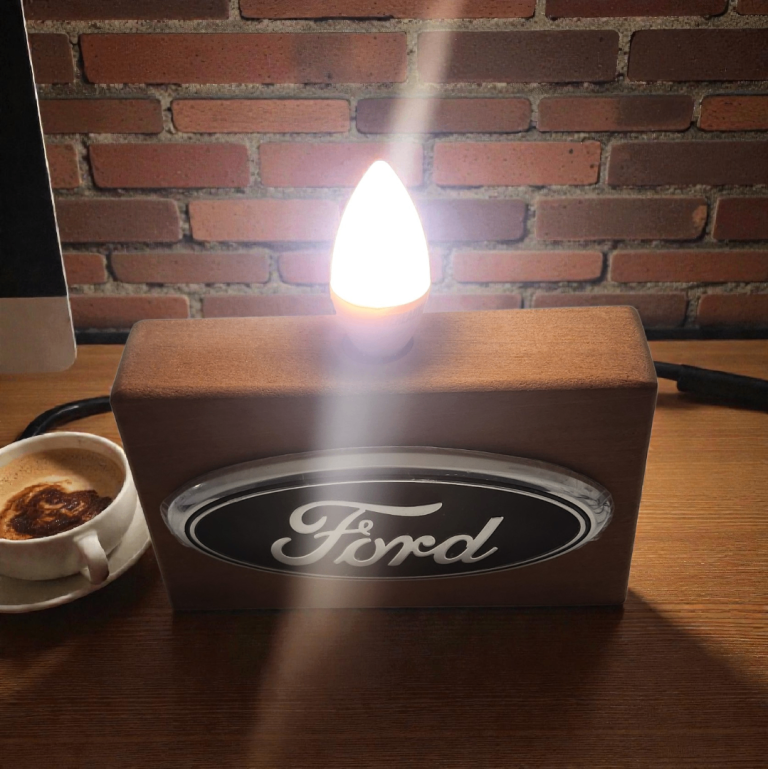 A striking handmade table lamp featuring a genuine large Ford bonnet badge, mounted on a solid mahogany wooden base. This unique piece has been carefully crafted to create a bold statement lamp that looks right at home in a man cave, garage, workshop, office, or automotive-themed room. The polished Ford emblem sits proudly in the centre, with a clean, minimalist lamp holder fitted above, giving off a warm ambient glow. The rich mahogany base adds a premium, classic finish that complements the iconic Ford branding perfectly. Each lamp is individually handmade, making every piece one of a kind. A perfect gift for Ford enthusiasts, classic car lovers, or anyone looking for something a little different from mass-produced lighting.Features: