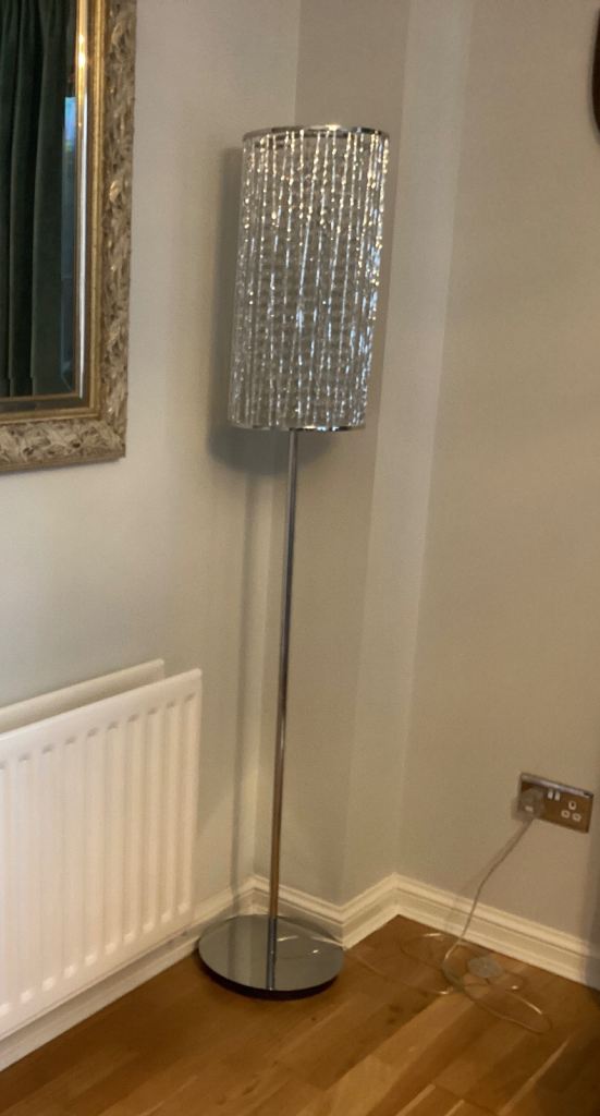 Lovely crystal and chrome ‘Emilia’ floor lamp with crystal drops bought from John Lewis as good as new. Height is 160cm approximately. It takes 3 halogen bulbs. Looks lovely in any room.