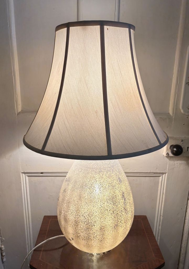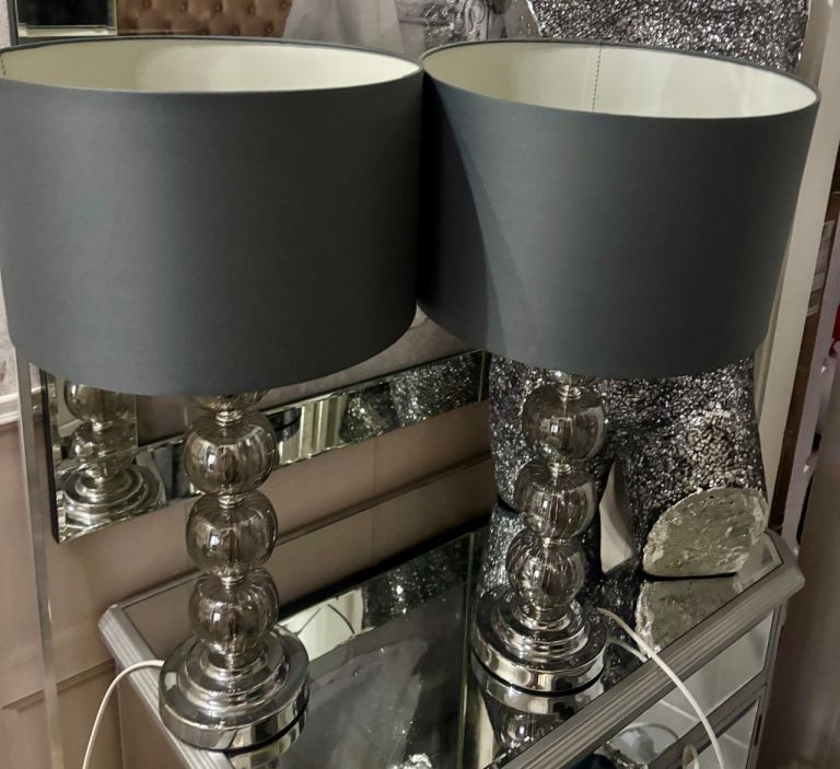 John Lewis Marilyn table lamp with chocolate brown suede shade and glass ball column base with chrome detail.