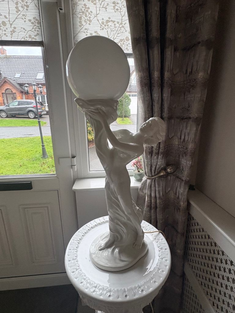 Beautiful white ceramic lady holding a lamp 65cm high. Very unusual and elegant as new condition.
