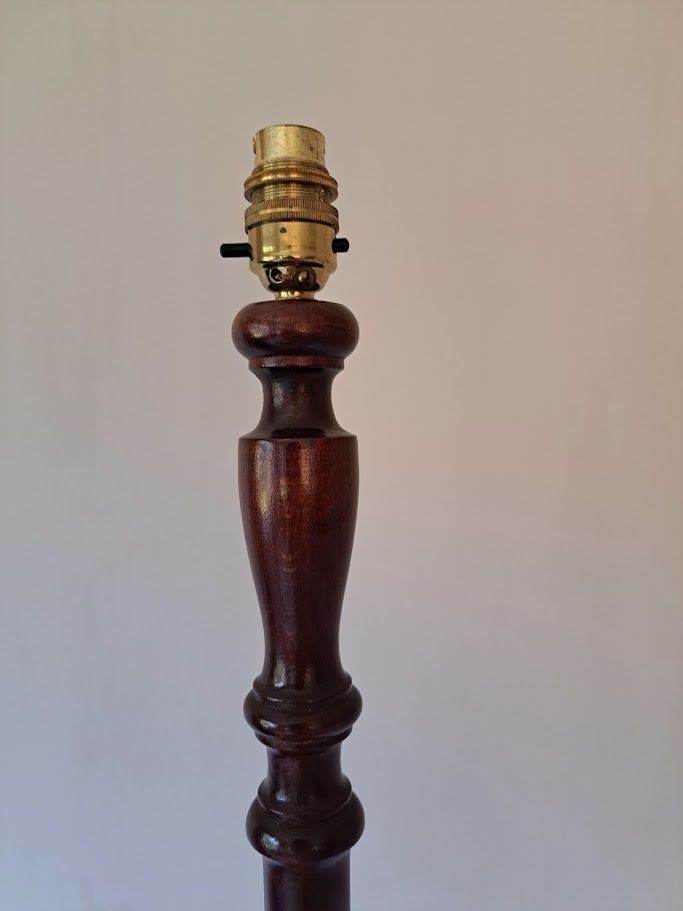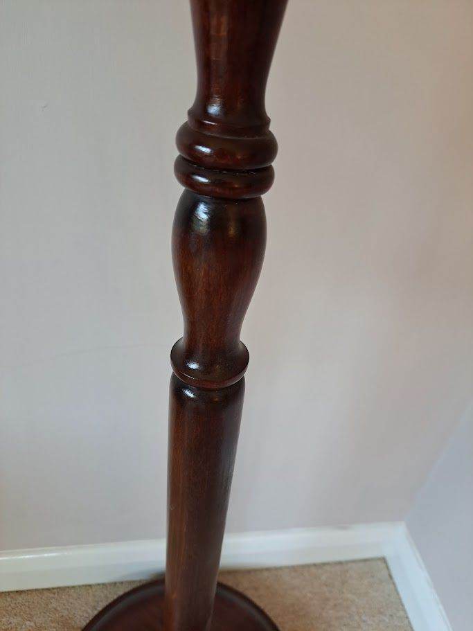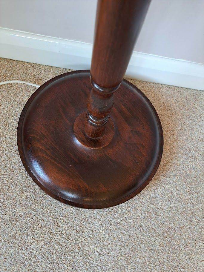 A beautifully carved lamp standard in dark wood which is highly polished. No shade comes with it as that is your personal choice. Height 158 cm and diameter of base is 36cm. It has 3 round feet underneath the base, so the base doesn't touch the floor.
