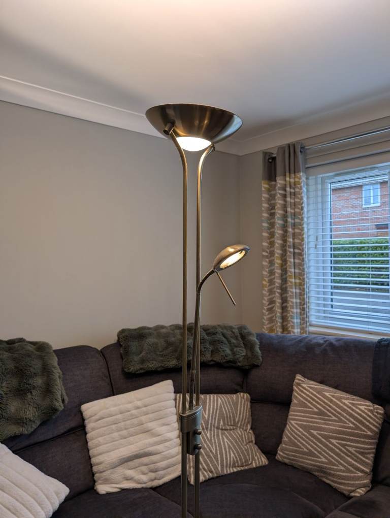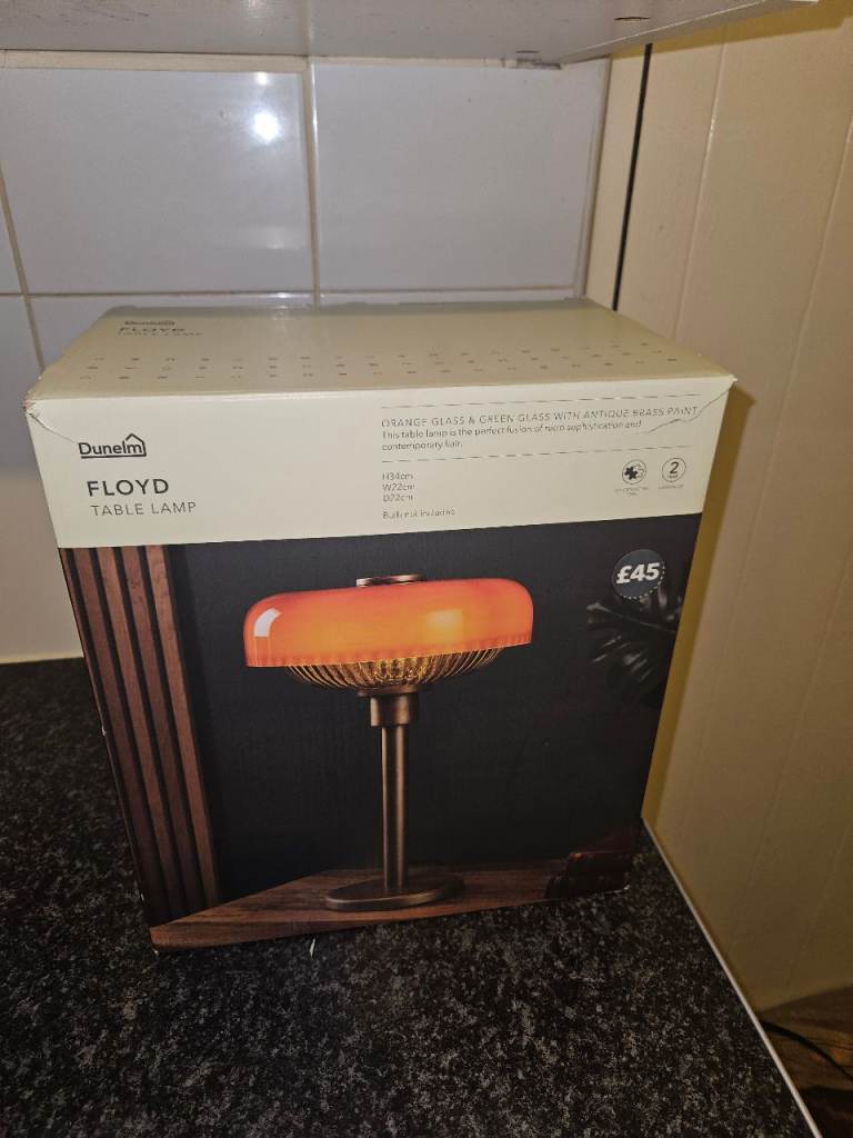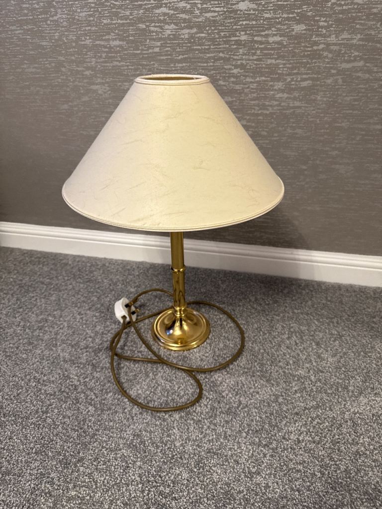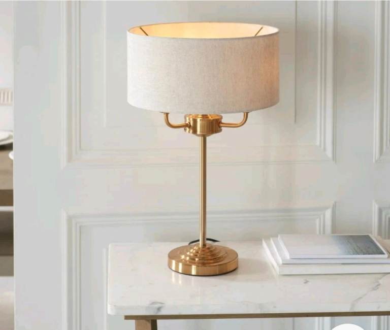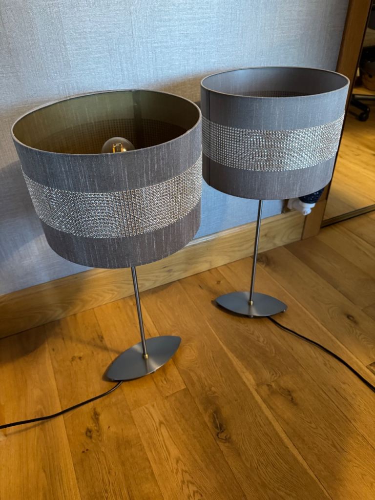 Pair of Brissi large glass table lamps with bespoke shades in Zoe Glencross honeycomb linen. In line switches. 68cm tall X 35cm wide. Collect Wimbledon Park.