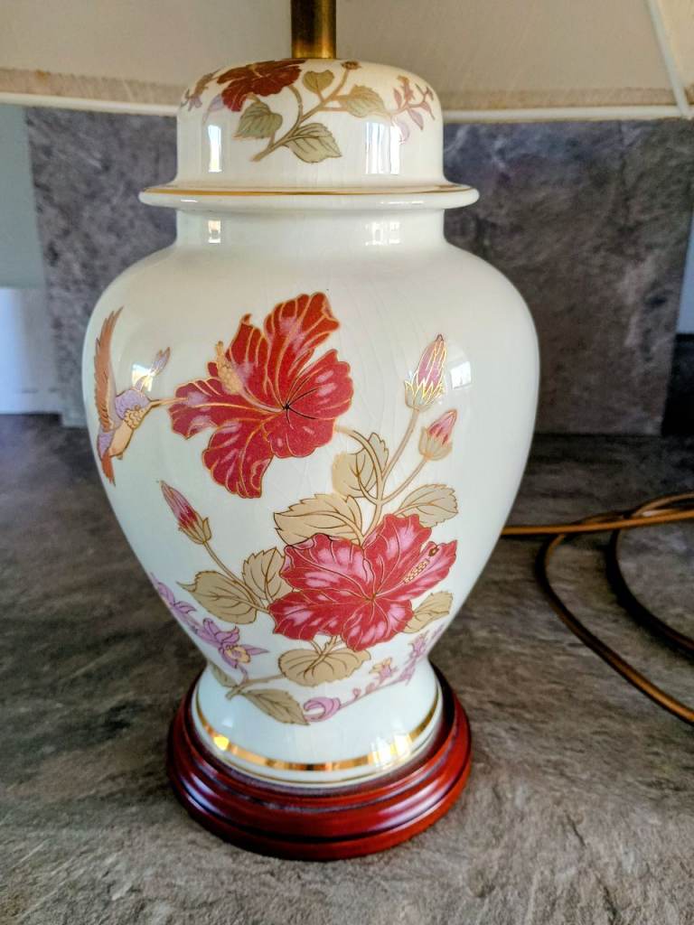 A beautiful table lamp with a ceramic base featuring a vibrant floral pattern.