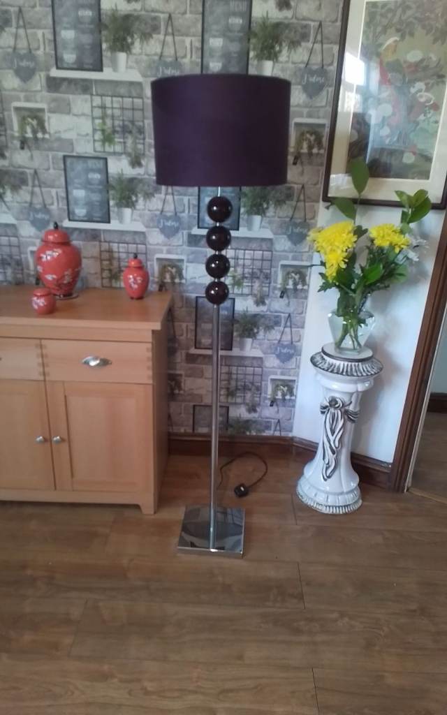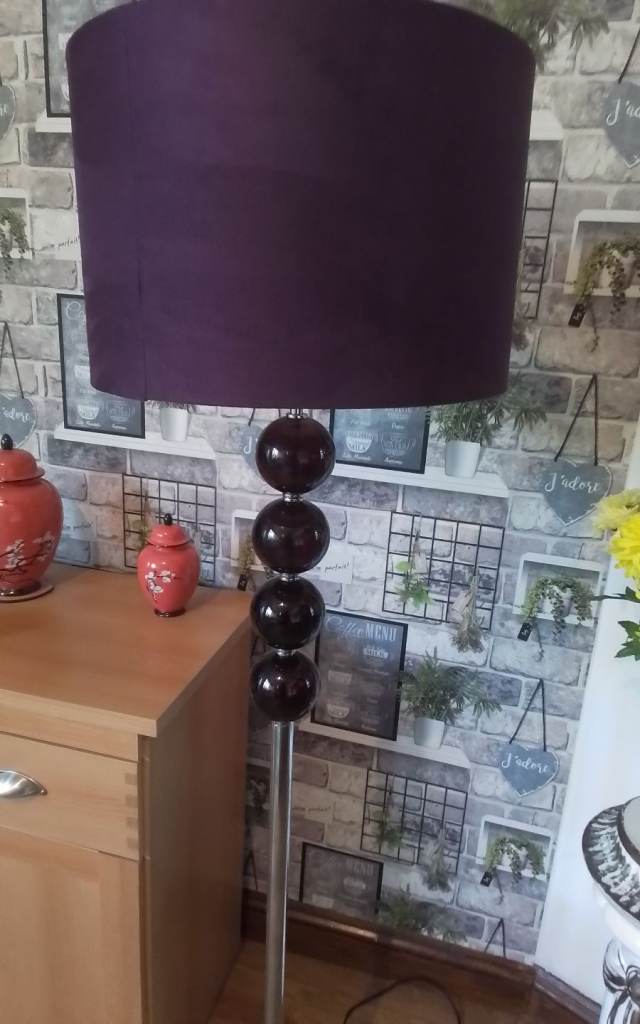 A lovely modern floor lamp in very good clean condition, standing on a square chrome base with 4 purple ornamental balls on the silver chrome stand, having a purple shade with bulb included, and measuring 158cm tall, a very stylish item, cash on collection from Wigan please or may be able to deliver for cost of fuel only thank you.