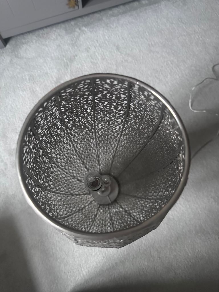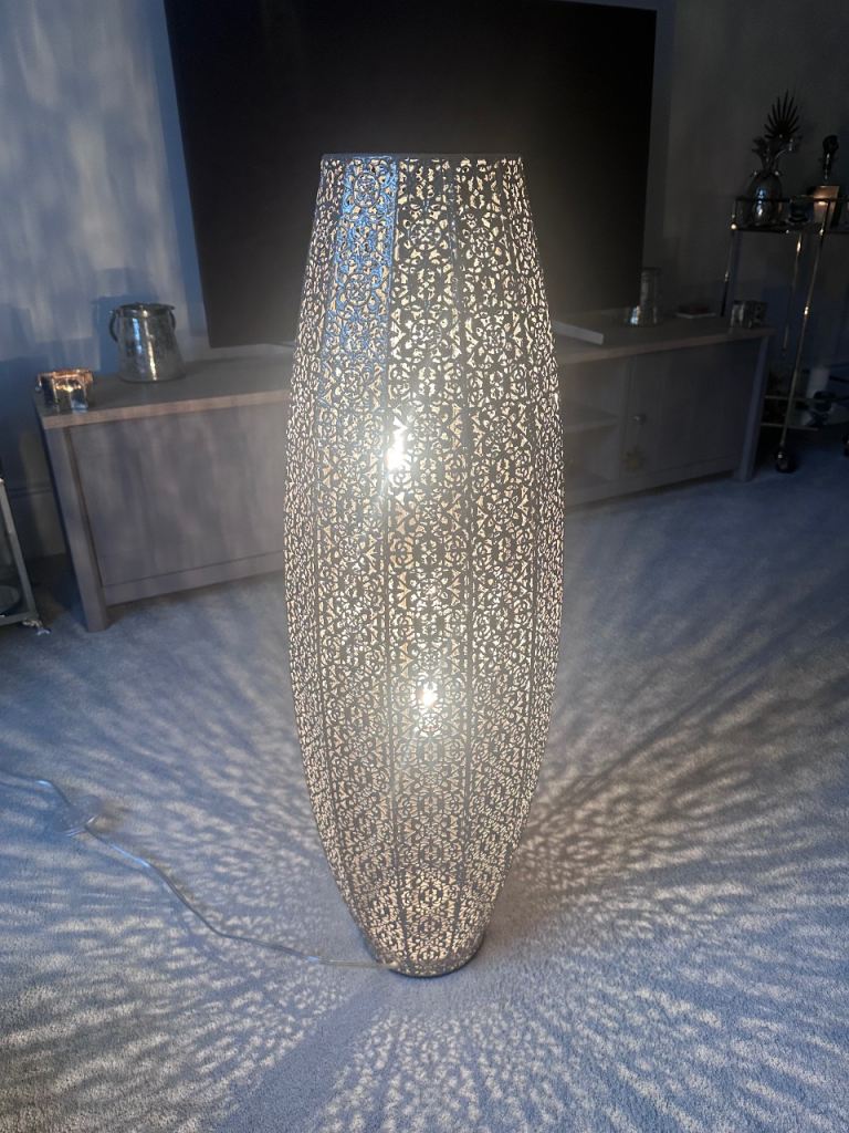 A Moroccan style metal floor lamp in silver from Next. Similar products retail for around £80 new.