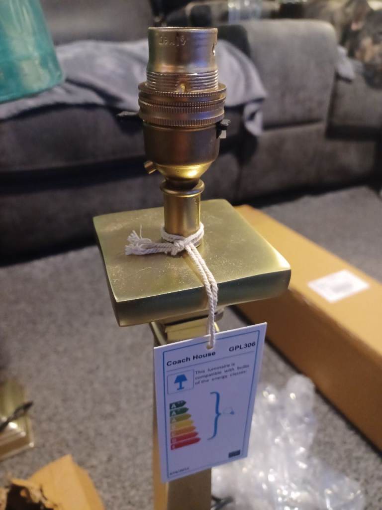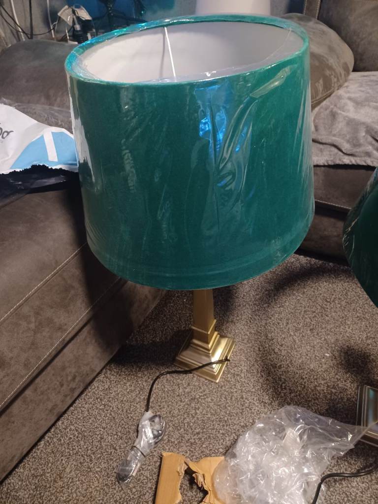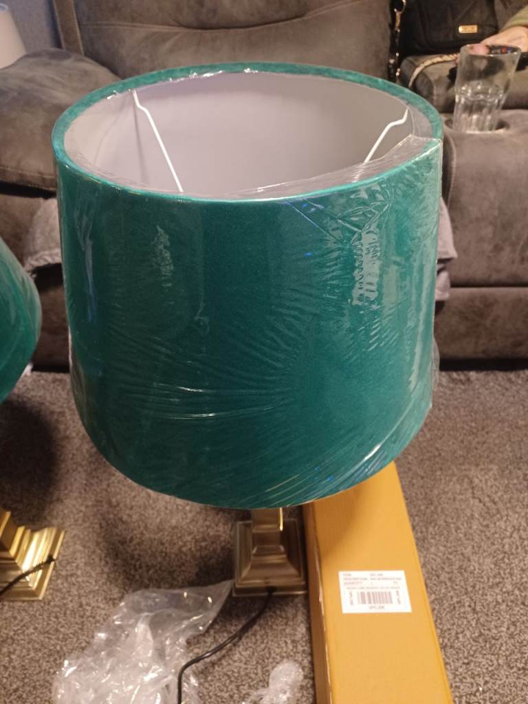 Table lamps lovely detailing with brass light shade fittings. There come with with 2 new sealed green velvet shades.
