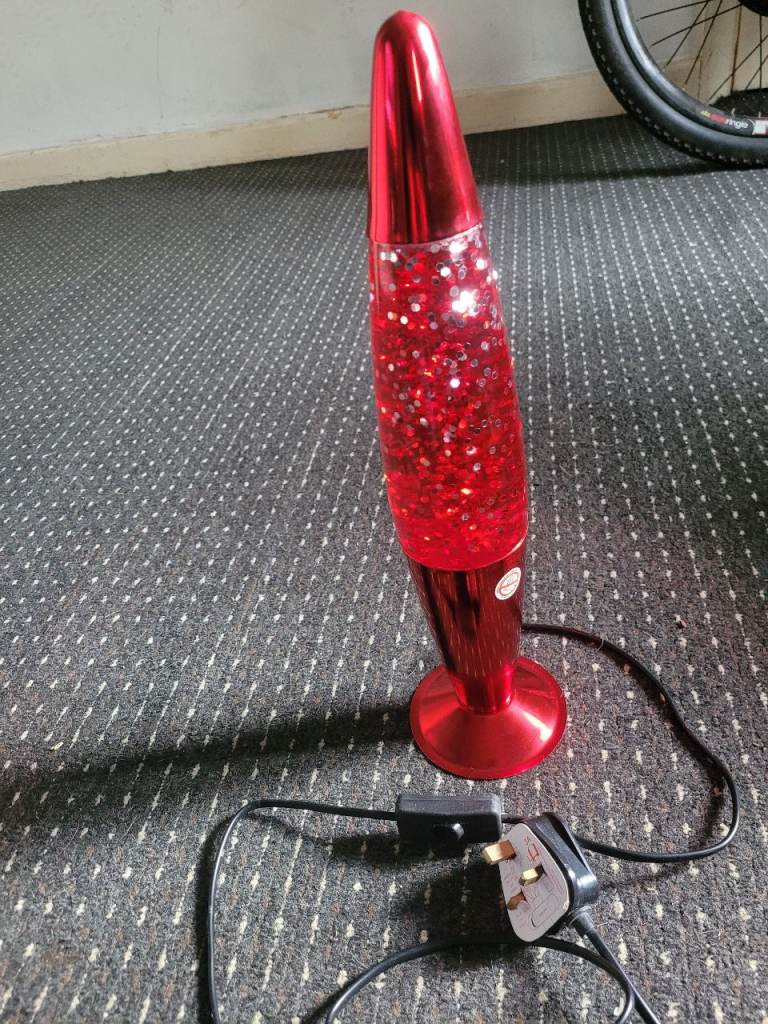 red lamp with silver glitter inside.