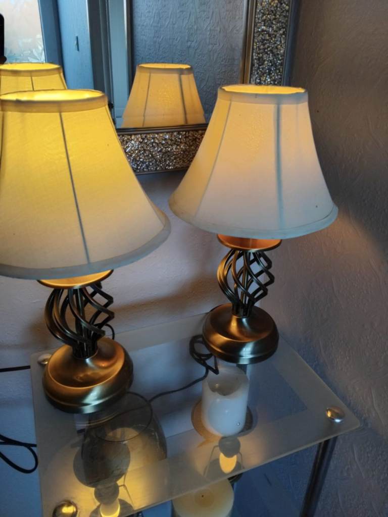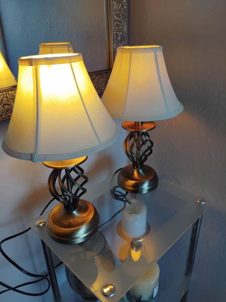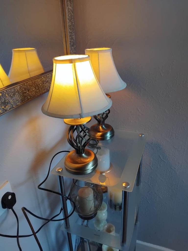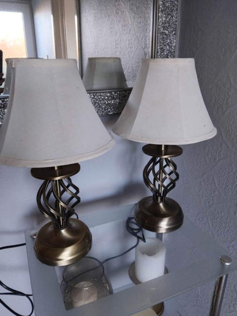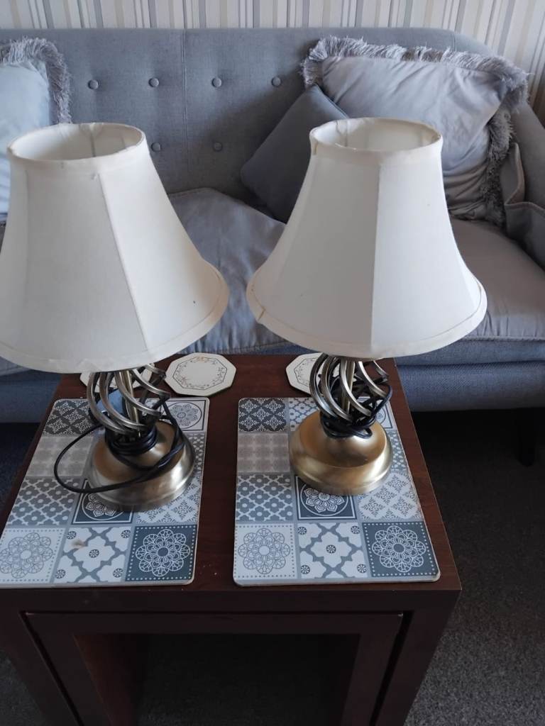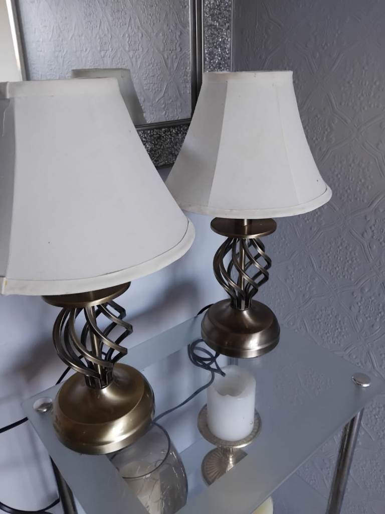 Set of 2 identical Bedside lamps on a gold colour metal frame includes white lampshade and bulb