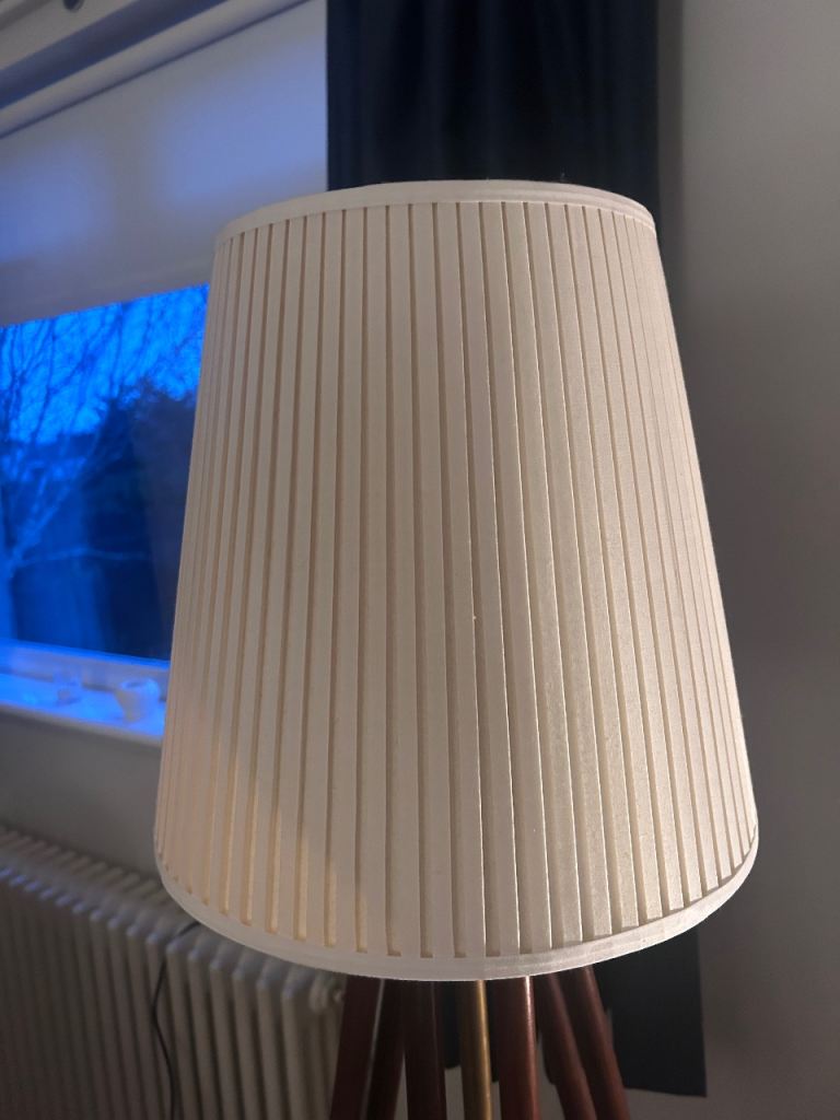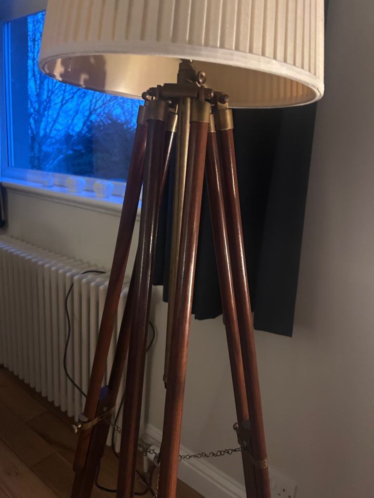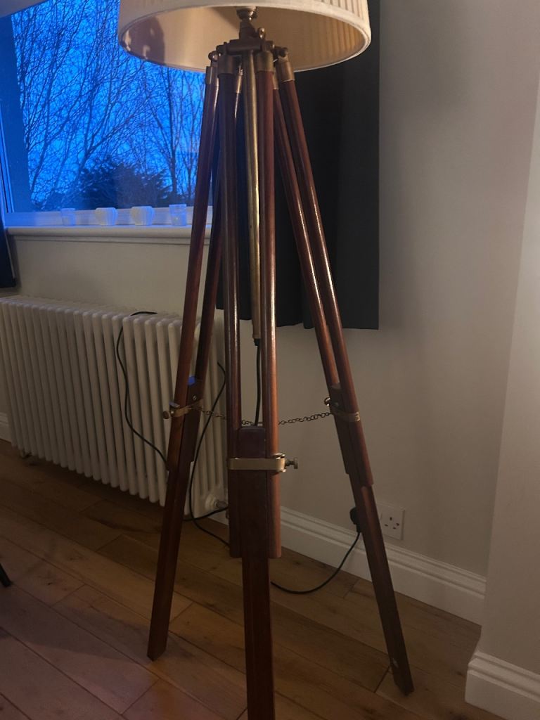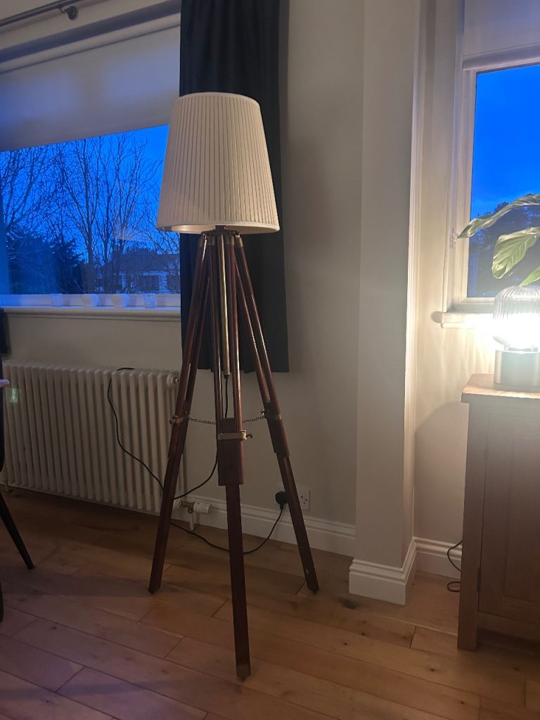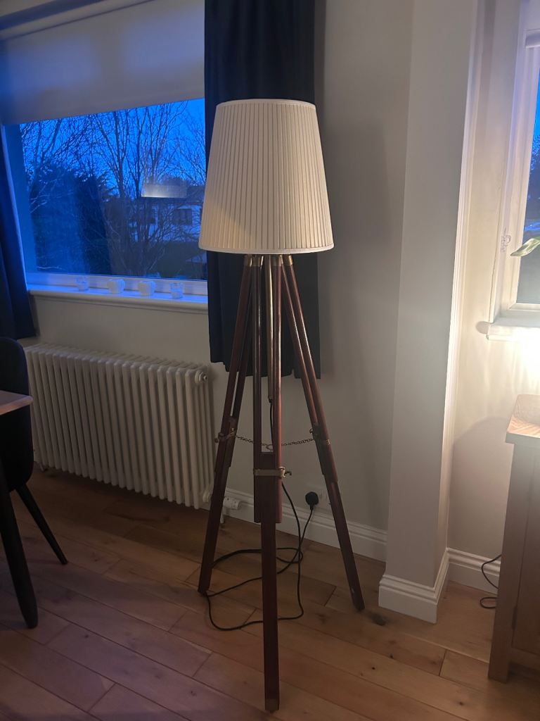 Elegant & Stylish Wooden Tripod Floor Lamp for sale. Sturdy wood base with soft cream shade, allows soft lighting, complements a variety of rooms. Well cared for and fully functional. Total height is 5ft 1 inch, wooden tripod 4ft. Pick up from bridge of weir only