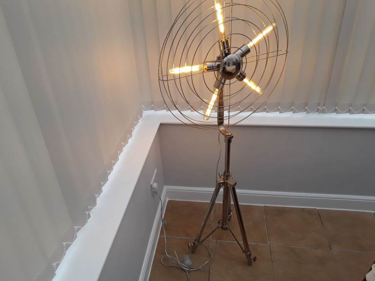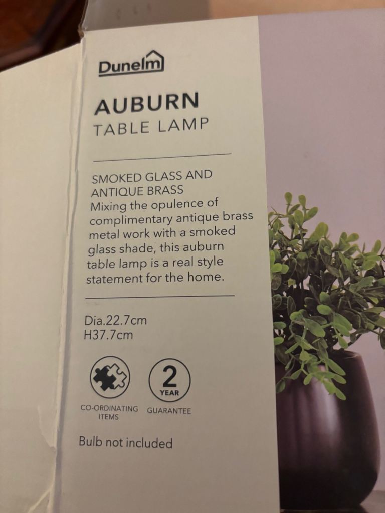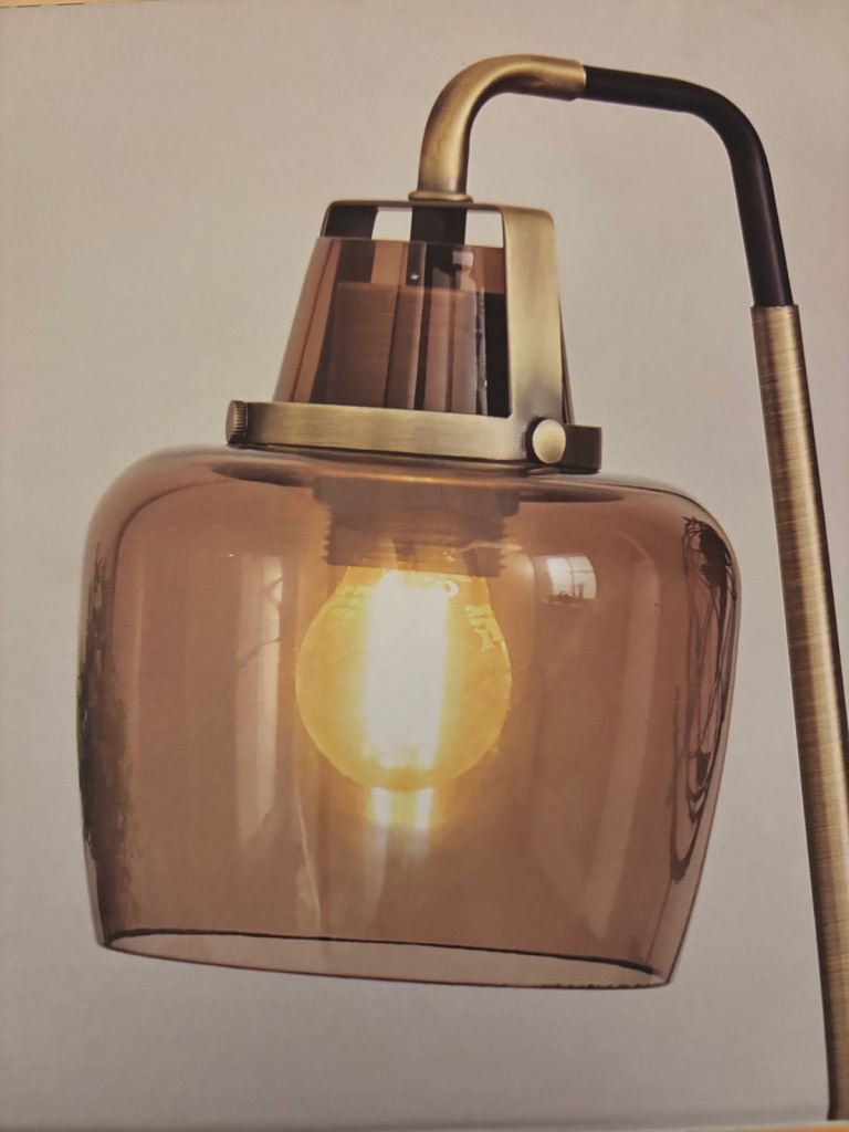 Smoked glass shade and antique brass lamp. Height 37.7 cm and diameter 22.7cm. Requires E27 bulb, max 13 watts. Cost £40 new.
