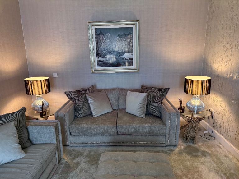 2 large Black and silver table lamps and 2 glass/metal side tables. Excellent condition, quality material. Collection only.