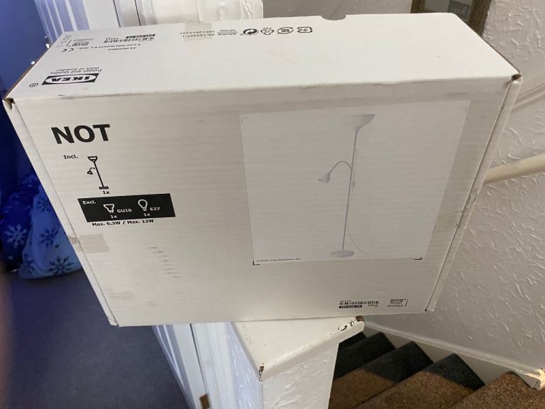 Tall standing floor lamp has 2 lamps with bulbs has an on off switch hardly used all in box with instructions