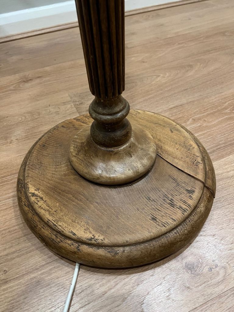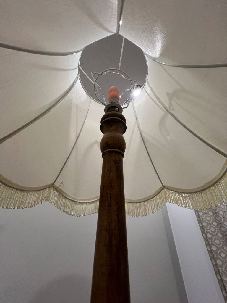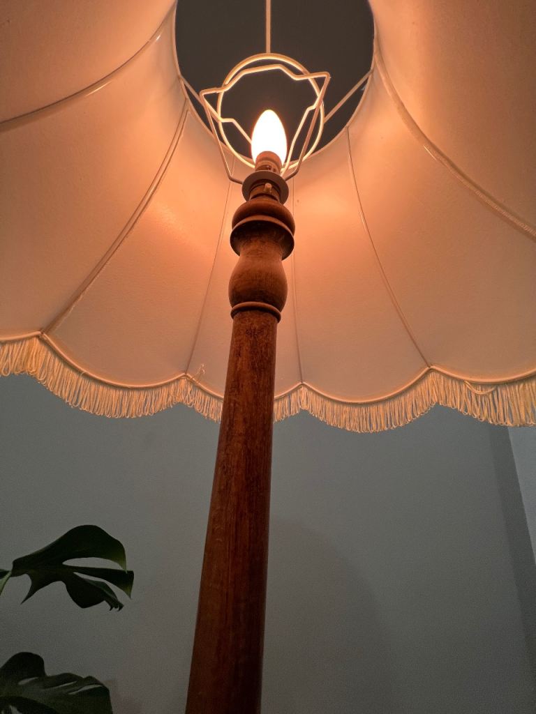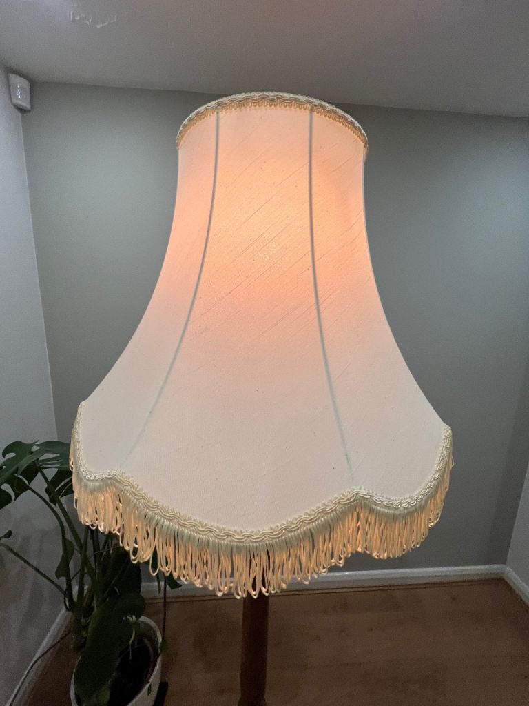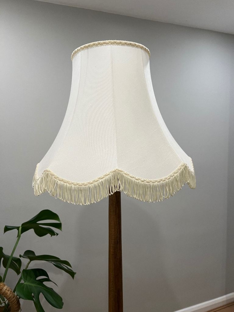 VINTAGE ANTIQUE WOODEN TURNED STANDARD LAMP WITH CREAM FRINGED TASSLES LAMPSHADE- WORKING