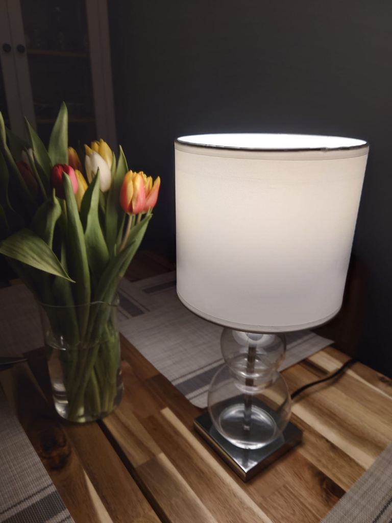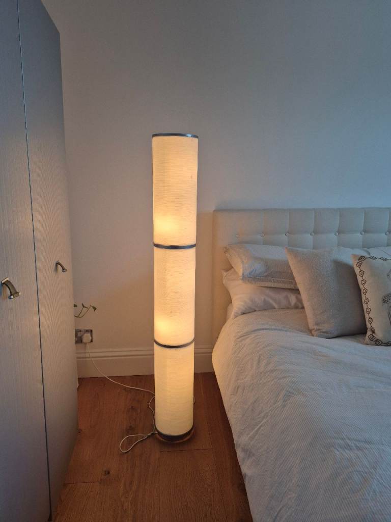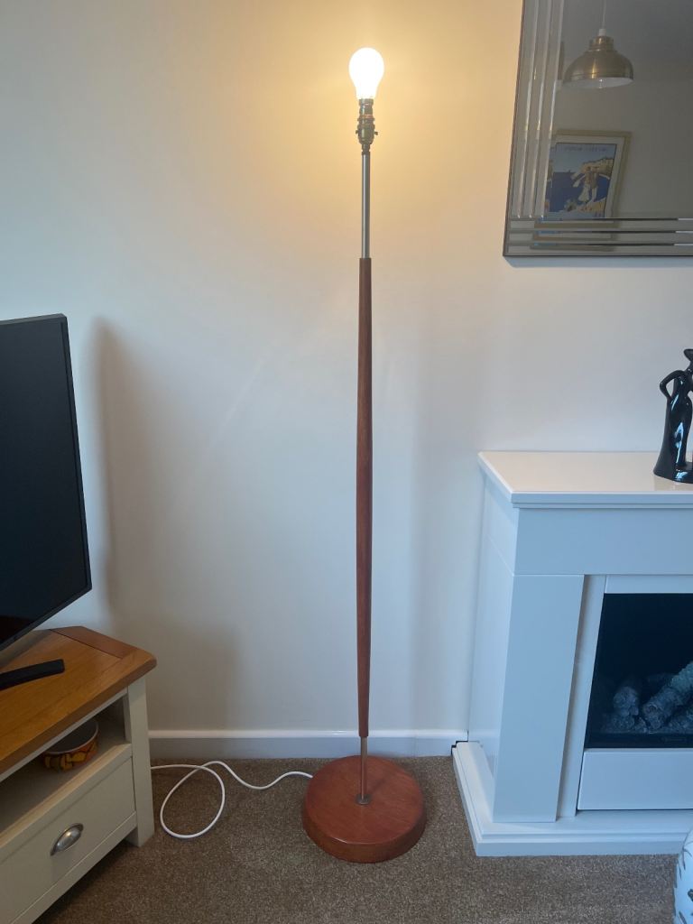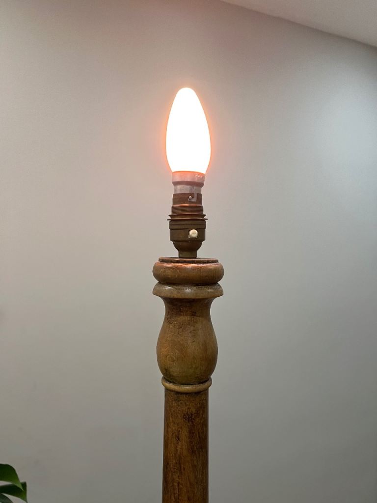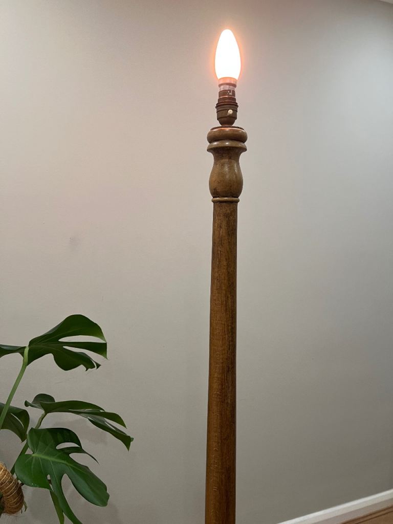 VINTAGE ANTIQUE WOODEN TURNED STANDARD LAMP WITH CREAM FRINGED TASSLES LAMPSHADE- WORKING