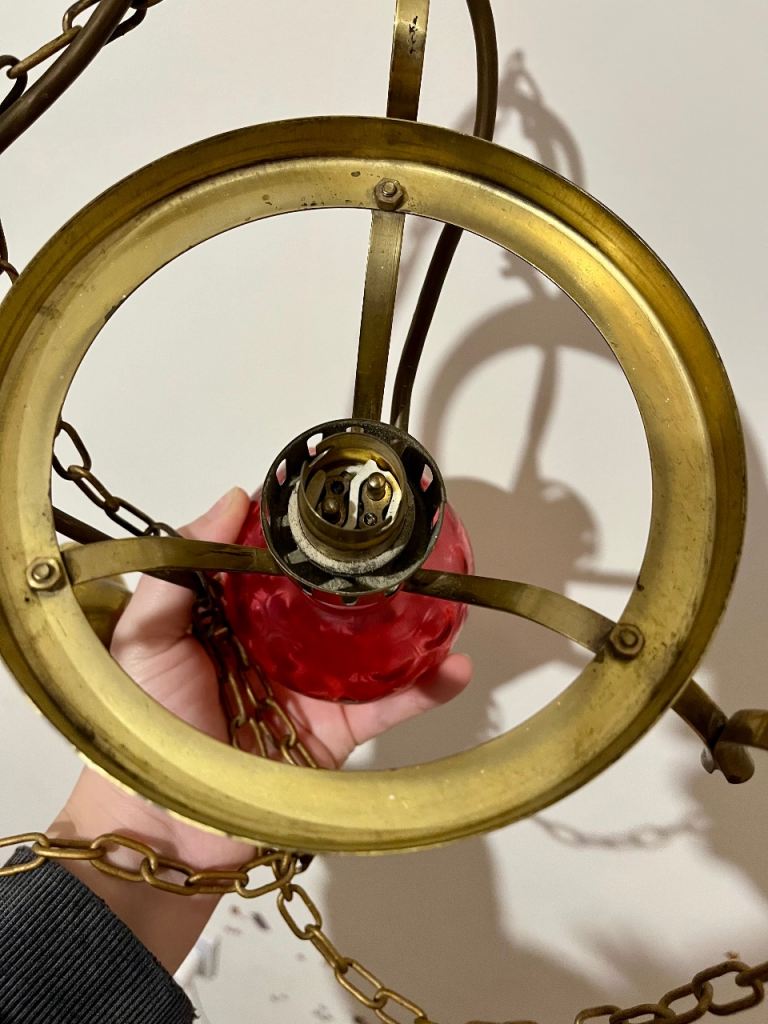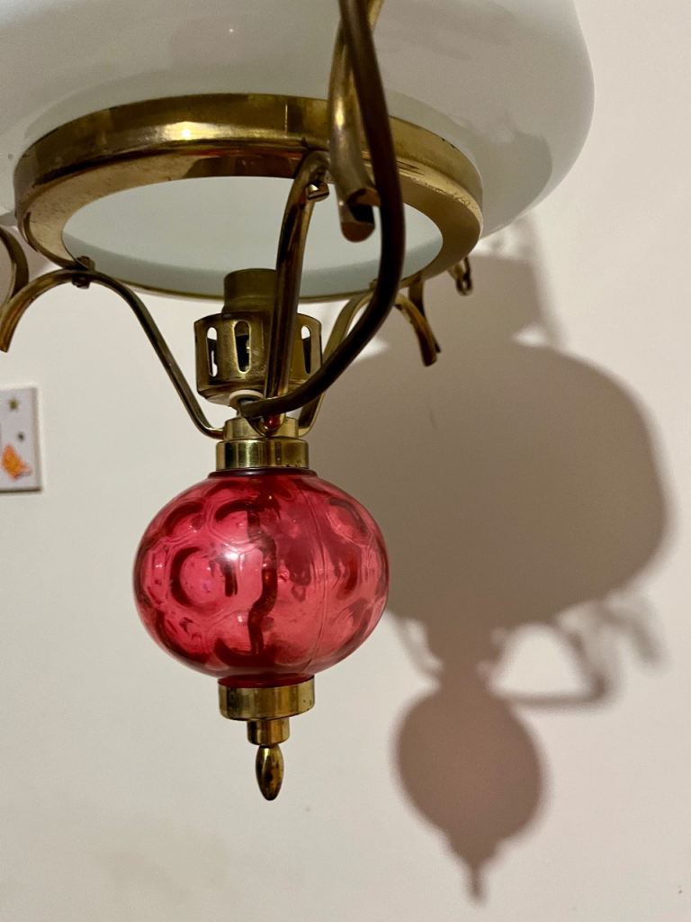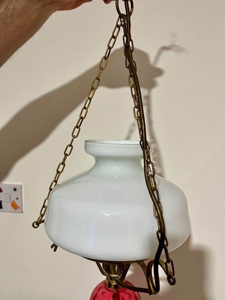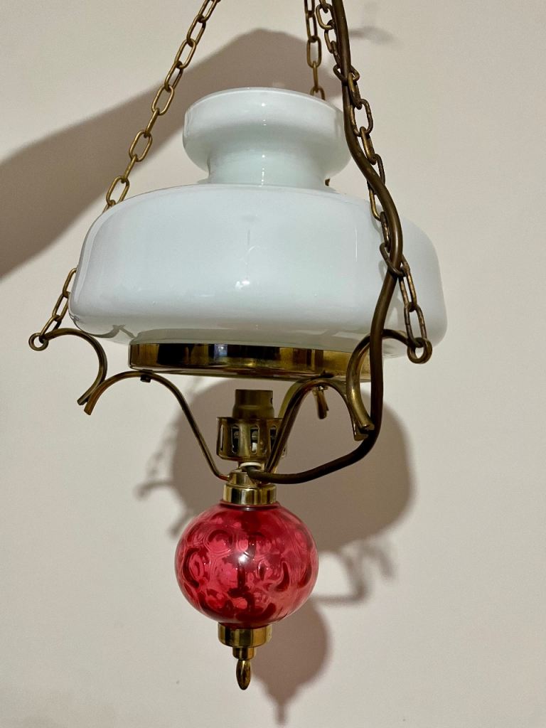 This is a vintage brass ceiling light converted from an oil lamp, featuring an opaline glass shade and a red glass font.