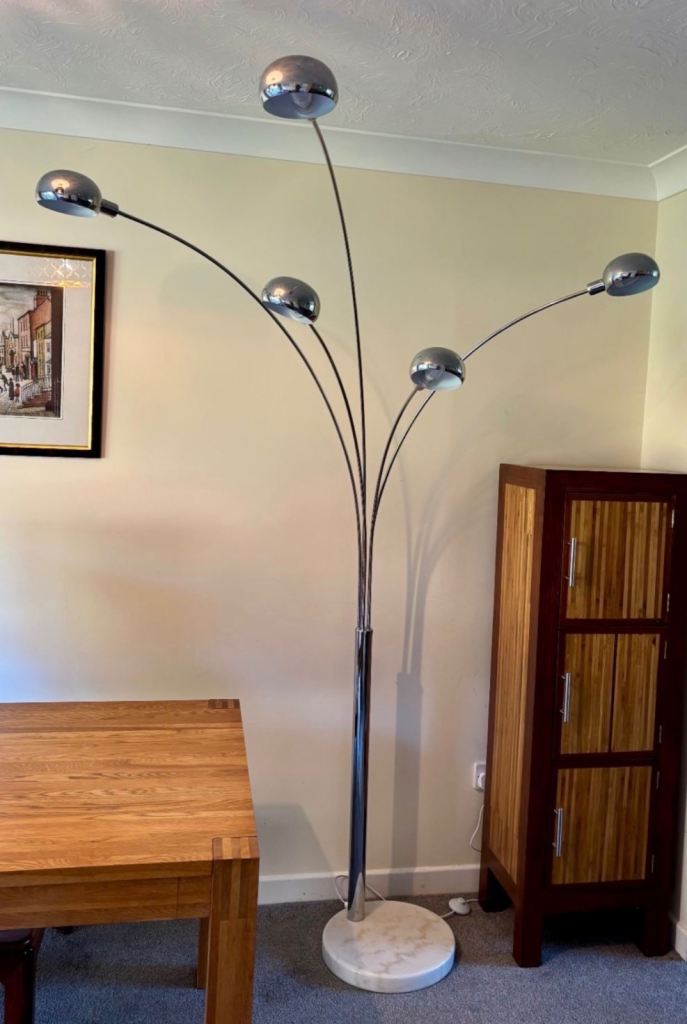 Features five polished chrome curved arms which allow the light to be emitted from above. The shades allow the light to be dispersed evenly throughout the room and the whole floor lamp is anchored by a heavy white marble base.