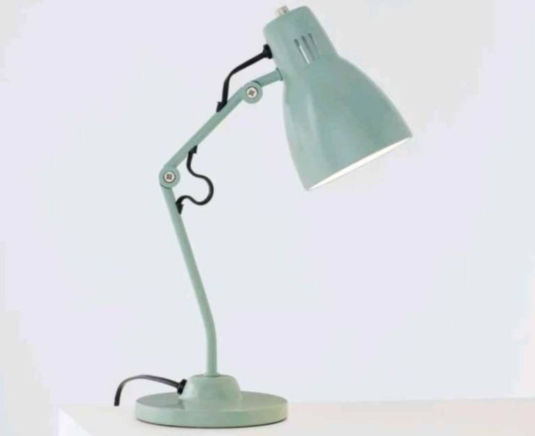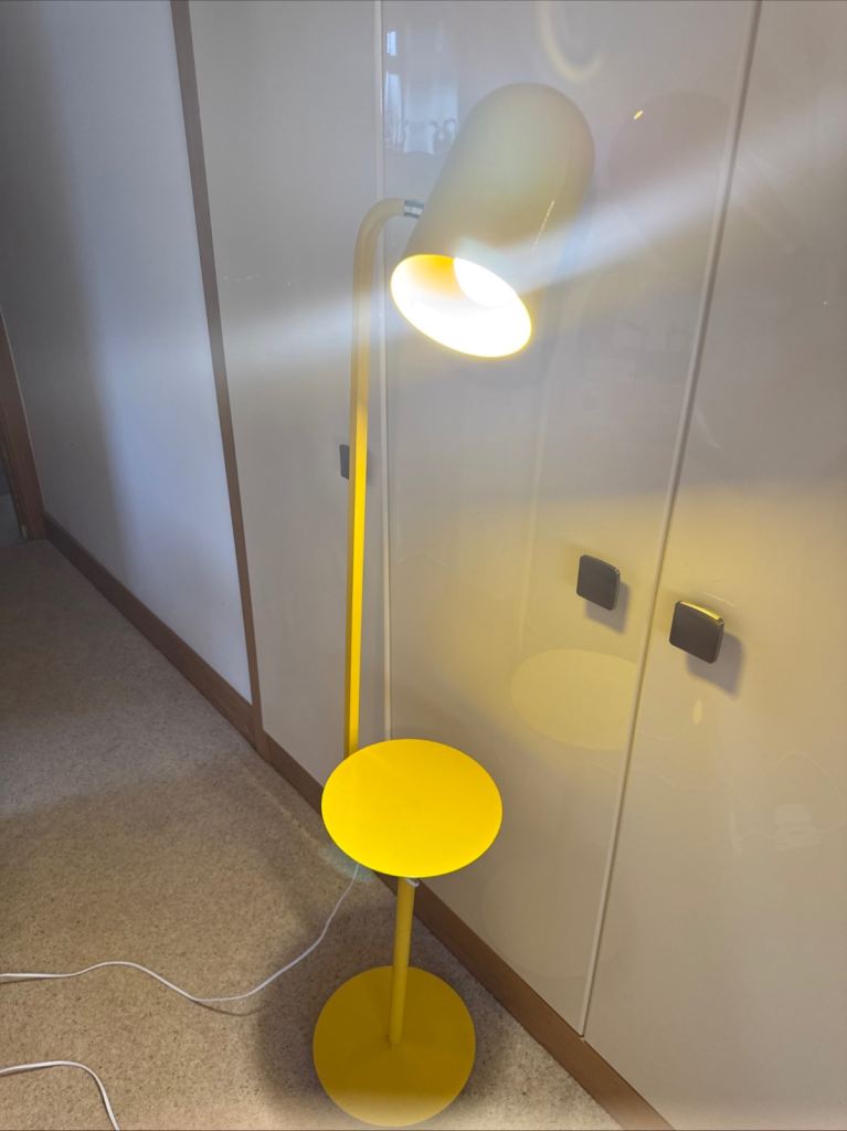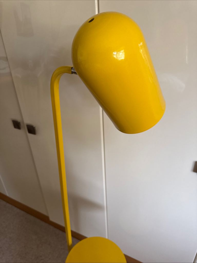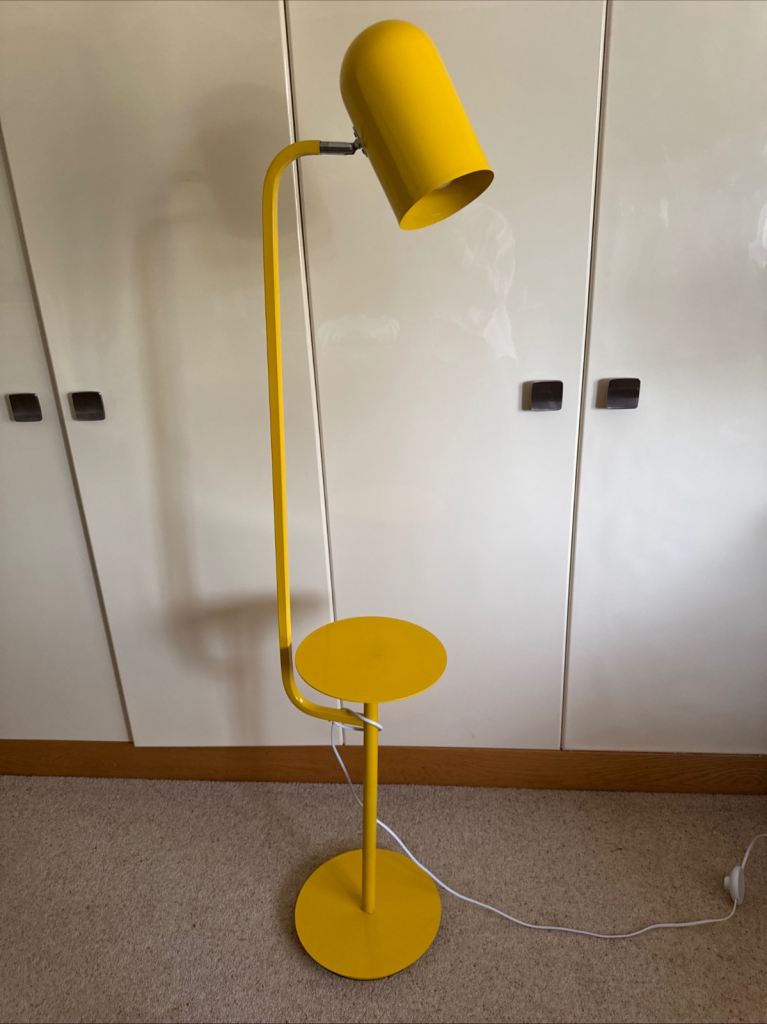 This Yellow Metal Floor Lamp with a Bell Shaped Angle poise Lamp and Shelf which can accommodate books, magazines, and because it has a very stable base, drinks, plates or bowls. It is a stylish and functional lighting solution for any home.