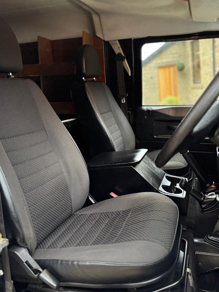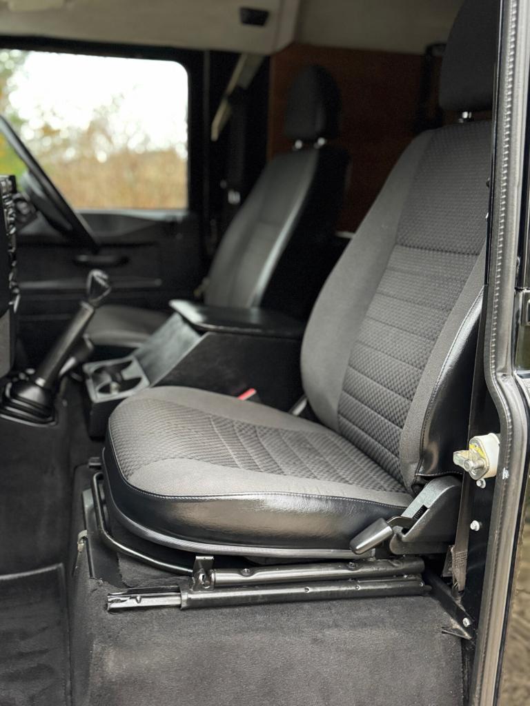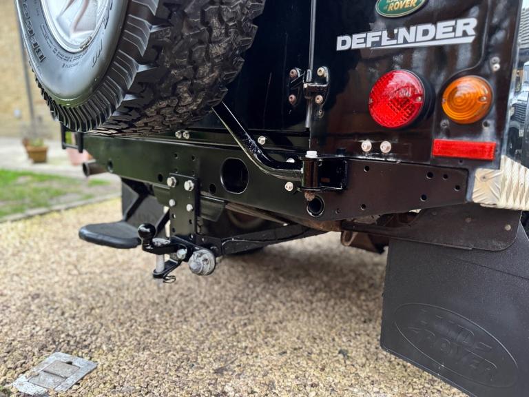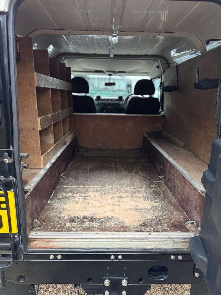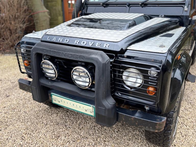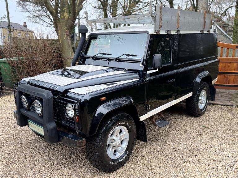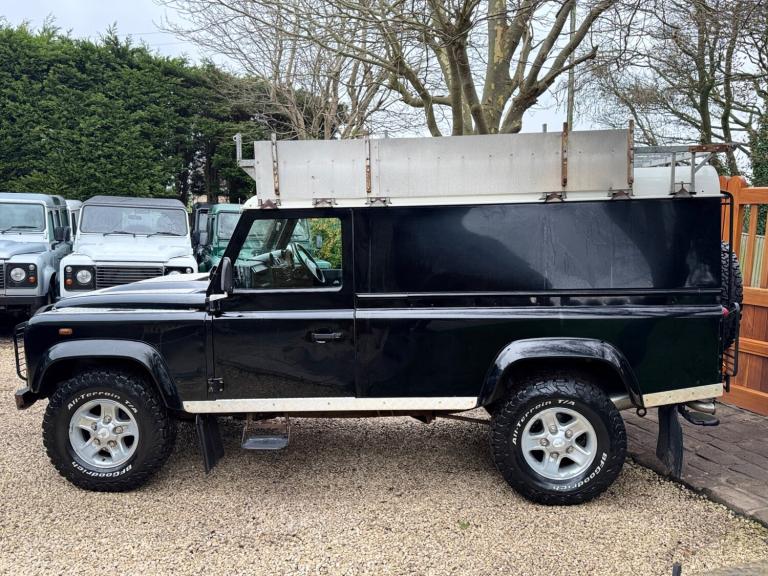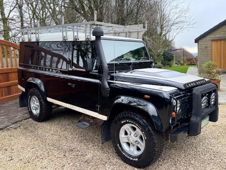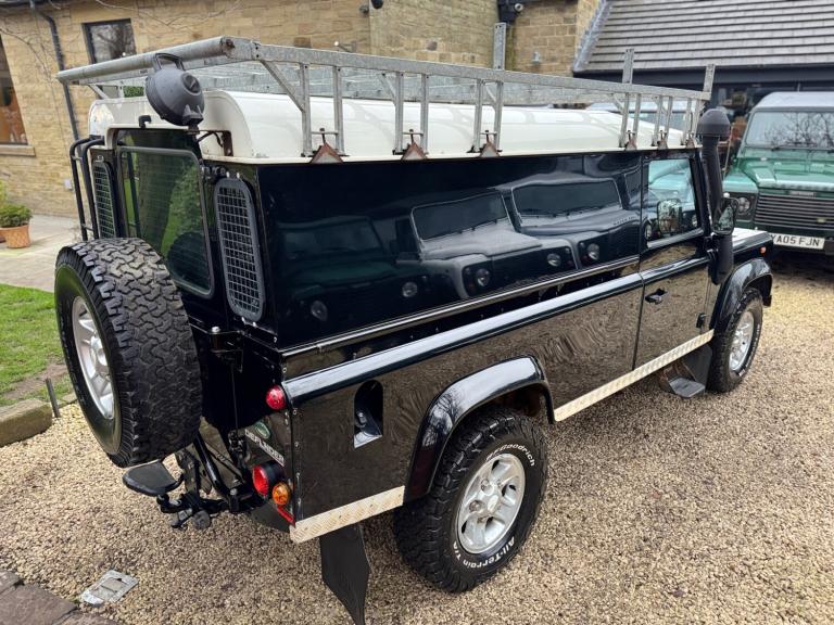 2008 08 Land Rover Defender 110 County hard top 2.4TDCi finished in Java black, full length roof rack, boost alloy wheels with BF Goodrich tyres, front A bar and spots, steering guard, chequerplate kit, black county cloth interior, electric windows, parrot handsfree, Mantec spare wheel carrier, rear ply lined, great workhorse, drives superb