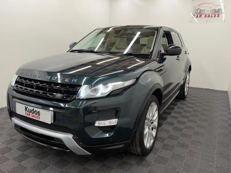 2014 LAND ROVER RANGE ROVER EVOQUE 2.0 Si4 DYNAMIC 5dr Automatic [ PETROL ] **LUX PACK** [ OVER £8000 OF FACTORY EXTRAS ]RARE PETROL EDITION, FINISHED IN STUNNING AINTREE GREEN. NO DEPOSIT FINANCE AVAILABLE FROM ONLY £256 per mth. EACH VEHICLE COMES WITH A FREE 6 MTH WARRANTY, HPI CLEAR REPORT AND 1 YEAR AA BREAKDOWN COVER. ONLY 83500 MILES. FULL SERVICE HISTORY [ 9 STAMPS ] AND LAST SERVICE @ 83500 MILES. MOT UNTIL 09/02/2027**ULEZ COMPLIANT**SUCH A STUNNING CAR AND REALLY LOVELY TO DRIVE. **HUGE LUX SPEC** FULL IVORY LEATHER INTERIOR, PANORAMIC ROOF WITH ELEC BLIND, 3 SETTING MEMORY ELECTRIC FRONT SEATS, HEATED FRONT AND REAR SEATS,CHILLED FRONT SEATS,SURROUND PARKING CAMERA, FRONT AND REAR PARKING SENSORS,AUTOMATIC PARKING,TOUCH SCREEN SAT NAV, CRUISE CONTROL, KEYLESS PUSH BUTTON START, ADJUSTABLE DRIVING MODES, TOUCH SCREEN DISPLAY, MERIDIAN SOUND SYSTEM, INDIVIDUAL CLIMATE CONTROL, XENON LIGHTS, LED DAYTIME LIGHTS, AIRCON, BLUETOOTH, DAB RADIO, ELEC POWERED BOOT, BLIND SPOT ALERT, POWER FOLDING MIRRORS, ELEC WINDOWS AND MIRRORS. UNMARKED 20'' ALLOY WHEELS. FINANCE PACKAGES - With a number of lenders on board i am able to offer Finance to suit individual circumstances, including Sub Prime. All CARS ARE HPI CHECKED AND CLEAR. WARRANTY - At KUDOS CAR SALES every vehicle comes with a FREE 6 MONTH Warranty. Any repairs under warranty can be carried out at your local garage -Extended warranty available on request at extra cost. PREVIOUS NON SMOKER. ***ALL PART EXCHANGE'S CONSIDERED***