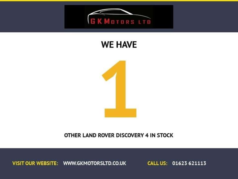 GK MOTORS LTD ARE DELIGHTED TO OFFER THIS 1 FORMER KEEPER LAND ROVER DISCOVERY 4 3.0 SDV6 SE TECH AUTO 4WD EURO 6 (256 BHP). FIRST REGISTERED ON 31/10/2015 BY LAND ROVER UK. COMING WITH SERVICE HISTORY AT THE FOLLOWING INTERVALS: 14K – 36K – 48K – 57K – 65K – 74K (INCLUDING CAMBELT) AND 89K, PLUS THE LATEST OIL/FILTER CHANGE, MOT AND HEALTH CHECK. THIS HIGH-SPEC, STRONG AND CAPABLE DISCOVERY WILL ALSO COME WITH 12 MONTHS AA PROTECTION FOR YOUR PEACE OF MIND WHEN PURCHASING.FINISHED IN STUNNING RHODIUM SILVER / INDUS SILVER WITH ALMOND LEATHER UPHOLSTERY, PRIVACY GLASS, ROOF RAILS, AND UPGRADED 19"" ALLOY WHEELS, THIS DISCOVERY 4 PRESENTS BEAUTIFULLY WITH A COMMANDING ROAD PRESENCE. IT ALSO BENEFITS FROM A PROFESSIONAL SNORKEL UPGRADE, MAKING IT EVEN MORE CAPABLE WHEN VENTURING OFF-ROAD.POWERED BY THE RENOWNED 3.0 SDV6 DIESEL ENGINE PRODUCING 256 BHP, THIS VEHICLE DELIVERS EFFORTLESS PERFORMANCE, OUTSTANDING TOWING ABILITY, AND A SMOOTH DRIVE THANKS TO THE 8-SPEED AUTOMATIC GEARBOX. WITH PERMANENT 4WD AND TERRAIN RESPONSE, THE DISCOVERY 4 REMAINS ONE OF THE MOST CAPABLE AND VERSATILE SUVS ON THE MARKET.THIS VEHICLE ALSO COMES WITH AN EXCELLENT RANGE OF FACTORY OPTIONAL EXTRAS, INCLUDING:• MANUAL LEATHER SEATS• ELECTRIC SEAT (NO MEMORY, 10X8)• METALLIC PAINT• ALMOND LEATHER INTERIOR• VENEER – GRAND BLACK LACQUER DOOR INSERTS & CENTRE CONSOLE (INCL. STEERING WHEEL FINISHERS)• TOWING PACK – 12N 7-PIN (UK TYPE)• TOWING PACK – 13-PIN (EURO TYPE)• PRIVACY GLASS (REAR OF B-POST)• ROOF RAILS – STANDARD & EXTENDED IN BLACK FINISH• CRUISE CONTROL• HEATED FRONT SEATS• FRONT PARKING AID• AUTOMATIC HEADLAMPS WITH HIGH BEAM ASSIST• CONVENIENCE PACK• 19-INCH 7-SPOKE ALLOY WHEELS• SNORKEL UPGRADE• UPGRADED ALLOY WHEELS""IF YOU'RE LOOKING FOR A PREMIUM 7-SEAT SUV THAT COMBINES LUXURY, PRACTICALITY, AND EXCEPTIONAL OFF-ROAD ABILITY, THIS DISCOVERY 4 SE TECH IS A STANDOUT CHOICE. REFINED, POWERFUL AND HIGHLY CAPABLE — A TRUE LAND ROVER ICON.""THIS VEHICLE IS SUPPLIED WITH A FULLY CLEAR MOTORCHECK CERTIFICATE, AND CAN BE READY TO DRIVE AWAY TODAY. **THIS CAR IS IN AMAZING CONDITION INSIDE AND OUT AND NEEDS TO BE VIEWED TO BE FULLY APPRECIATED****RESERVE YOUR NEW VEHICLE NOW FOR ONLY £250. PLEASE CALL TO MAKE AN APPOINTMENT AND AVOID DISAPPOINTMENT****DEBIT CARD AVAILABLE****PART EXCHANGE AND FINANCE AVAILABLE WITH OVER 20 LENDERS AVAILABLE****TAKE THE STRESS OUT OF USING 3RD PARTY FINANCE COMPANIES - WE WILL USUALLY GET YOU A BETTER DEAL****£299 ON THE ROAD FEE WHICH COVERS**FULL PROFESSIONAL VALET**12 MONTHS AA BREAKDOWN COVER **ALL REQUIRED DVLA CHANGES** MOT ON ARRIVAL**FULL HEALTH CHECK**NEW NUMBER PLATES**HPI AND HISTORY CHECKS**WARRANTY SET UP**SUFFICIENT FUEL**GK MOTORS LTD PACKAGE:-AA APPROVED -12 MONTHS AA BREAKDOWN INCLUDED-12 MONTHS MOT UPON ARRIVAL INTO STOCK-NATIONWIDE WARRANTY -100% HPI CLEAR SO BUY WITH CONFIDENCE-INDOOR SHOWROOM VIEWING AVAILABLE-5* CUSTOMER REVIEWS-ASK FOR ALLOY WHEEL UPGRADE/COLOUR CHANGE-VEHICLES ARE AVAILABLE TO DRIVE AWAY TODAY PLEASE ASK FOR MORE DETAILS-SATNAV:NG199BG