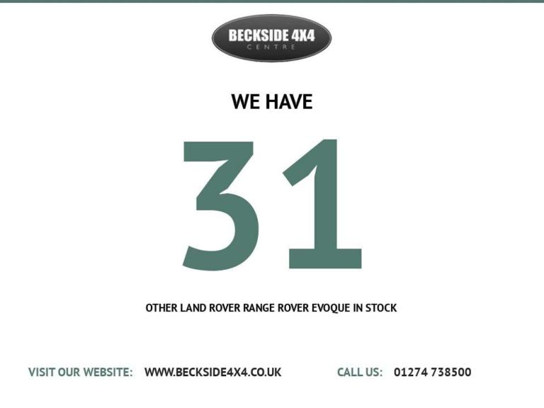 AA Inspected for Your Peace of MindTake advantage of our low-rate, no-deposit finance options. We're open 7 days a week, and this vehicle must be seen to be fully appreciated. It's in excellent condition, boasts a fantastic specification, and offers great value. Features include:Privacy GlassBlack LeatherSat Nav20"" Upgraded AlloysSide StepsAnd much more!Over 30 Evoques in stockPlease call us for more details. We offer competitive part-exchange prices. This vehicle comes AA Vehicle Inspected, with a comprehensive 128-point report ensuring its roadworthiness. It also includes Gold Plus Warranty for added peace of mind.As an approved AA dealer, we offer:128 Point AA Inspection12 months free AA Breakdown CoverAA Vehicle CheckApproved Finance OptionsWe are a family-run business with over 50 years of experience in the motor trade. Nationwide delivery is available, and we welcome exporters. We accept debit and credit cards.We are authorised and regulated by the Financial Conduct Authority.Visit our website for up to 40 detailed pictures per vehicle: [Website URL removed] keep around 100 vehicles in stock and are proud to be Yorkshire's largest 4x4 dealer. Most vehicles come with:AA Inspection Report12 months MOTServicingValetedHPI clearWe offer PX, finance, and warranties on most cars. Drive-away insurance is also available (subject to status).For more information, call our sales team at 01274 738500, or reach Richard via WhatsApp or text at 07796612999.For Sat Nav, use postcode BD2 1QN.Due to our large stock, not all vehicles are stored on-site, so please call ahead to avoid any disappointment.