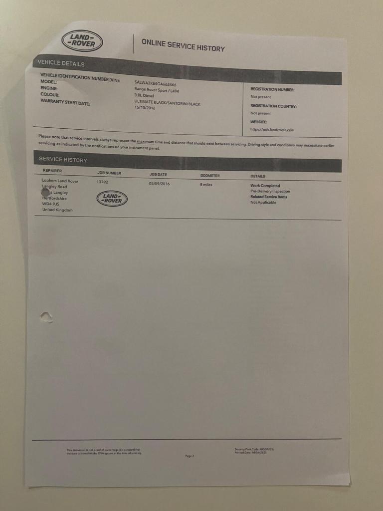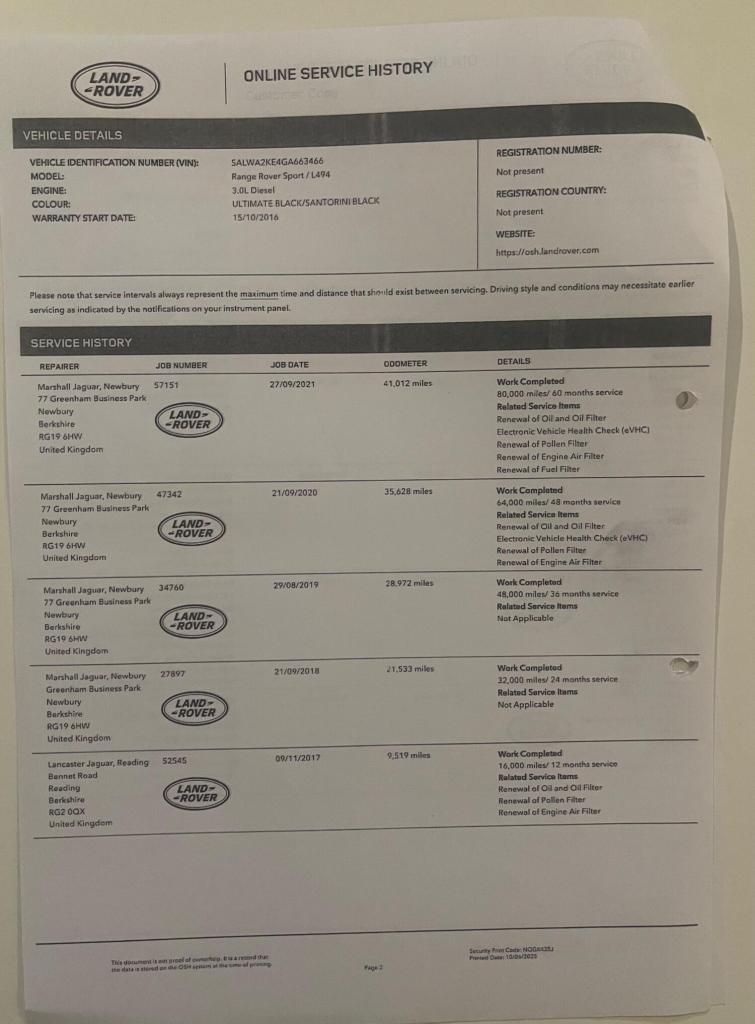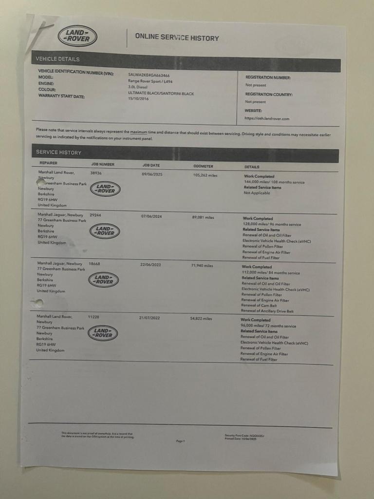 Registration for this car is LS66 STZONE Owner From NewBoasting a full dealership service history and a single owner from new, this 2016 Land Rover Range Rover Sport SD V6 HSE presents a compelling proposition. This four wheel drive model, powered by a 3.0L Euro 6 diesel engine, offers impressive performance with a 0-60mph acceleration time of just 6.8 seconds. Its HSE trim level ensures a premium experience, complemented by notable features such as the fixed panoramic roof with a powered blind, providing an airy cabin. The vehicle also includes powered 5+2 seating with 18 way adjustment for both driver and passenger, complete with memory functions, and painted side sills and bumpers for a refined exterior.The MOT remains valid until August 2026, offering peace of mind for the new owner. The last service was completed on 9th June 2025 at 105,262 miles, underscoring the meticulous care this vehicle has received, setting it apart from others in its class.Supplied New by Lookers Land Rover9 Main Services HistoryPDi @ 05/09/2016 with 8 miles @ Lookers Land RoverService @ 09/11/2017 with 9,519 miles @ Lancaster Jaguar ReadingService @ 21/09/2018 with 21,533 miles @ Marshall Land Rover NewburyService @ 29/08/2019 with 28,972 miles @ Marshall Land Rover NewburyService @ 21/09/2020 with 35,628 miles @ Marshall Land Rover NewburyService @ 27/09/2021 with 41,012 miles @Marshall Land Rover NewburyService @ 21/07/2022 with 54,822 miles @ Marshall Land Rover NewburyService @ 22/06/2023 with 71,940 miles @ Marshall Land Rover NewburyService @ 07/06/2024 with 89,081 miles @ Marshall Land Rover NewburyService @ 09/06/2025 with 105,262 miles @ Marshall Land Rover NewburyPlease find the following video weblinks helpful to make an informed decision;[Website URL removed]