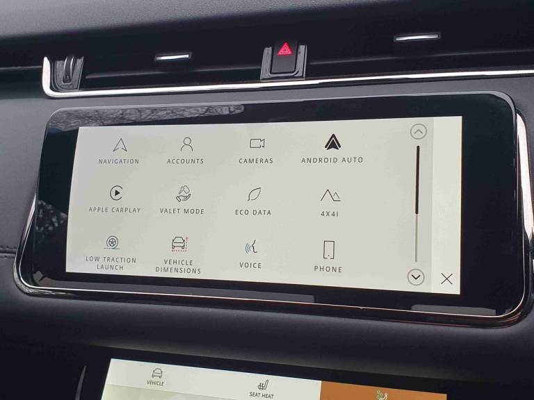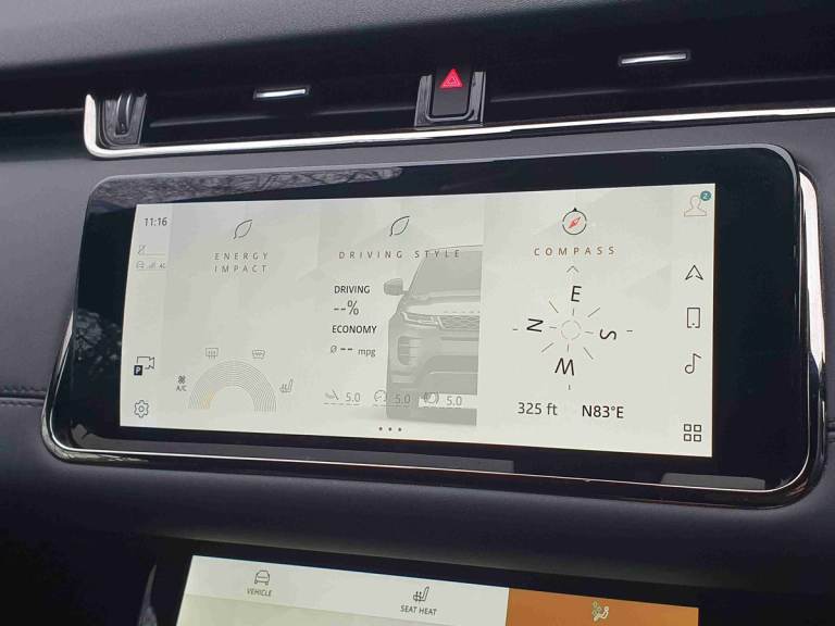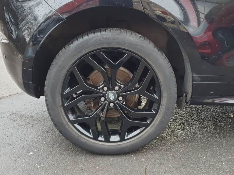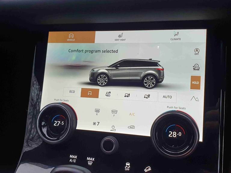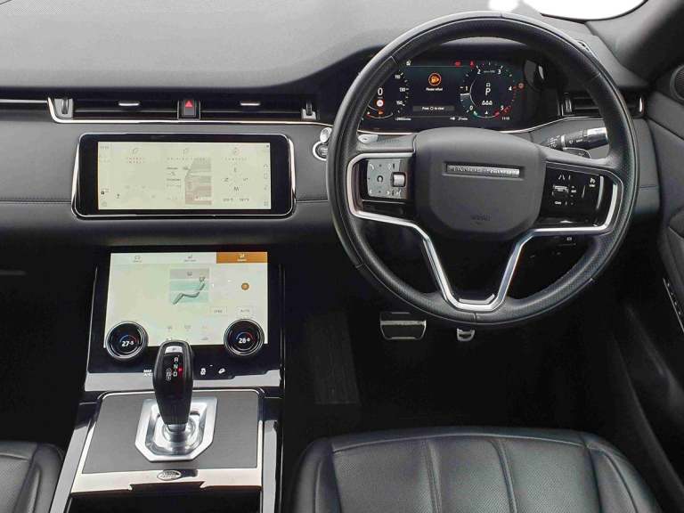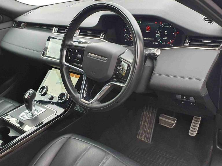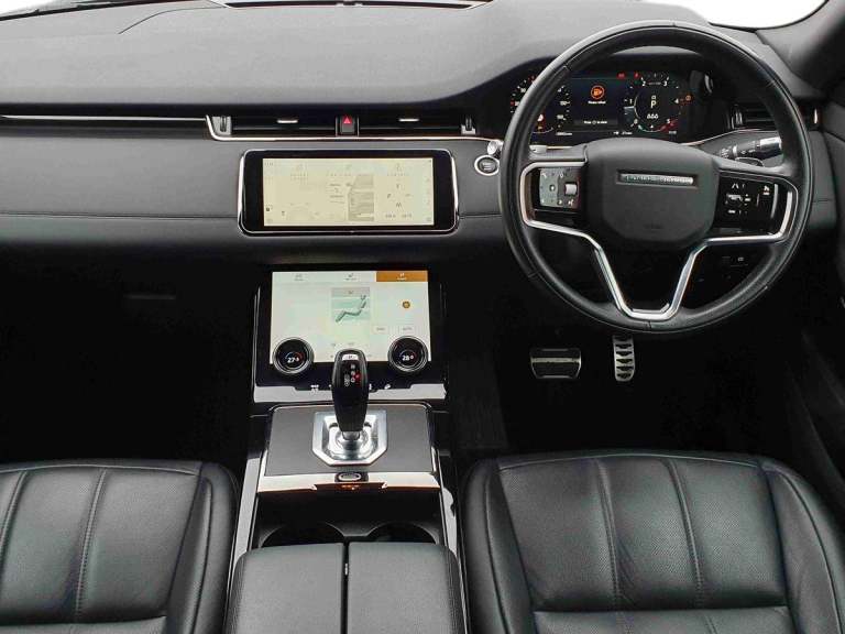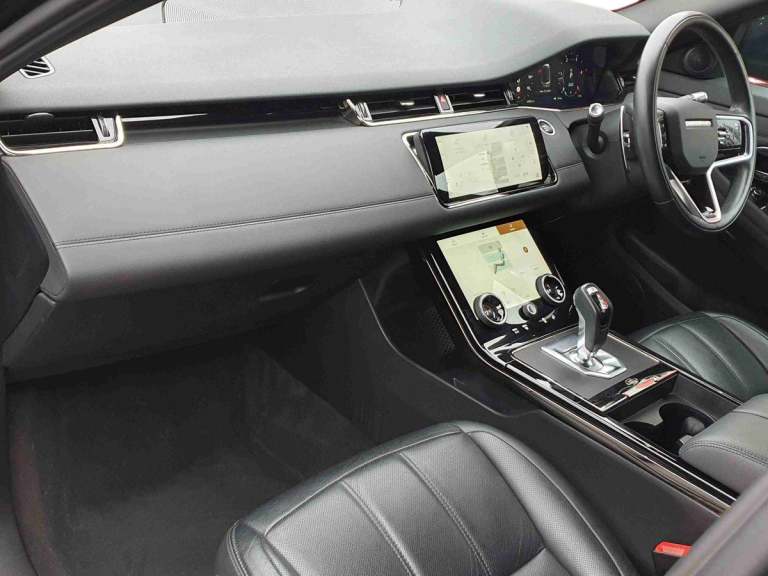..10'' deployable touchscreen with lower touchscreen, Android Auto, Apple car play, Blind spot assist, Bluetooth connectivity, Brake pad wear indicator warning light, Clear exit monitor, Driver condition monitor, Electronic power assisted steering (EPAS), Front and rear parking aid, InControl remote, Interactive Driver display instrument cluster, Land Rover InControl apps, Lane keep assist, Pivi pro connected includes upgraded infotainment, connected navigation pro, Nuance speech licence, Push button starter, Rear traffic monitor, Traffic sign recognition with adaptive speed limiter, Voice control system, All terrain progress control, Efficient Driveline, Passive suspension, Terrain Response 2 Auto, Digital Audio Broadcast radio-DAB, Steering wheel mounted controls, Automatic headlight levelling, Electric windows with one touch open/close and anti trap, Evoque and R-Dynamic badge, Flush deployable exterior door handles, Heated rear window with timer, Heated washer jets, Heated windscreen, Power fold, auto-dimming, heated door mirrors with approach lights and auto dimming driver side, Rain sensing windscreen wipers, Rear fog lights, Tailgate spoiler, 40:20:40 split folding rear seats with centre headrest and armrest, Ambient interior lighting, Bright metal pedals, Isofix system on outer rear seats, Overhead lighting console, Overhead stowage for sunglasses, Passive front head restraints, Rear air vents, Rear centre headrest, Satin chrome gearshift paddles, Sunvisors with illuminated vanity mirrors, Twin sliding front centre armrest, 3 rear 3 point seatbelts, Anti-lock braking system (ABS), Customer configurable autolock, DSC - Dynamic Stability Control, Electronic brake force distribution, Electronic parking brake, Electronic traction control, Emergency braking, Front and rear seatbelt reminder, Hill descent control, Hill launch assist, Low traction launch, Power operated child locks, Roll stability control, Six airbags - Driver and passenger airbags/driver knee airbag/front side airbag and curtain airbags, Torque vectoring brake, Tyre pressure monitoring system, Alarm, Immobiliser, Intrusion sensor, Locking wheel nuts
