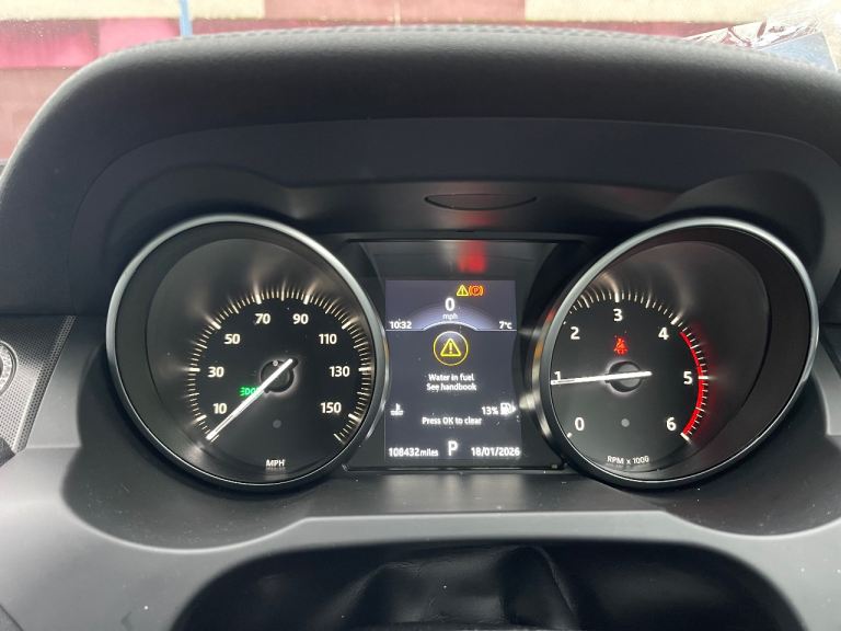 The car displays a "water in fuel" fault. A rigorous diagnosis has been performed, and it is confirmed to be a suspected electrical sensor/dashboard issue rather than an actual fuel system fault.