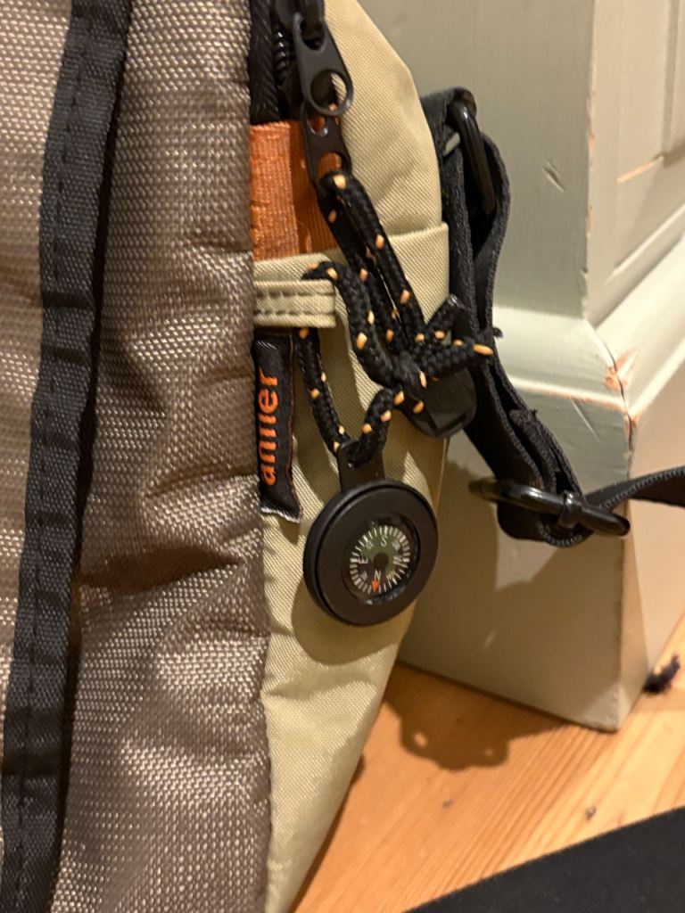 A waterproof Antler camera/laptop bag with its strap and a compass attached. Some marks on the base.