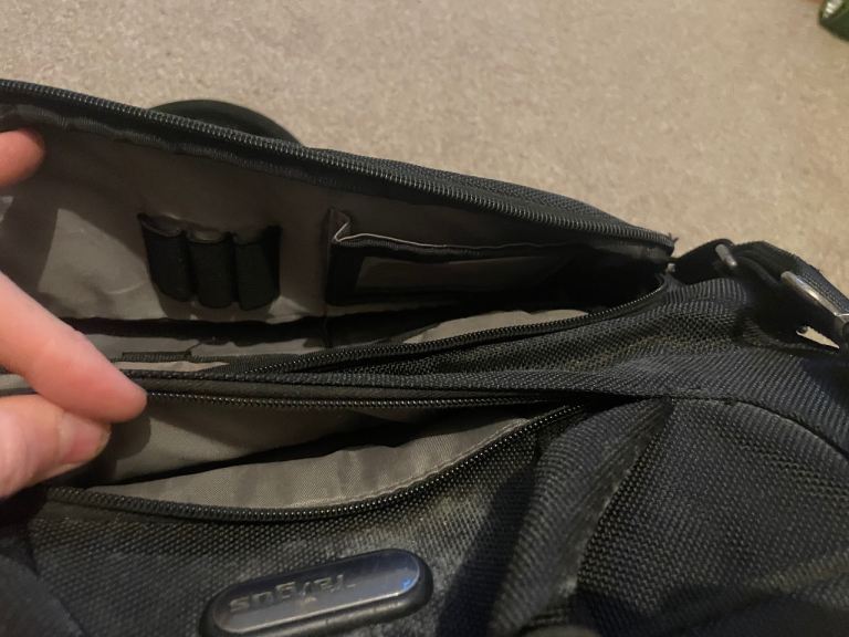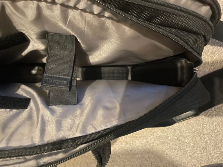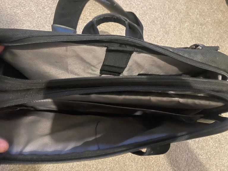 All zips are working! Could do with a bit of a clean but it will clean up. Comfortable shoulder strap with padding and ordinary carry handles. Various sections for pens, chargers etc. good level of thick protection to protect laptop.