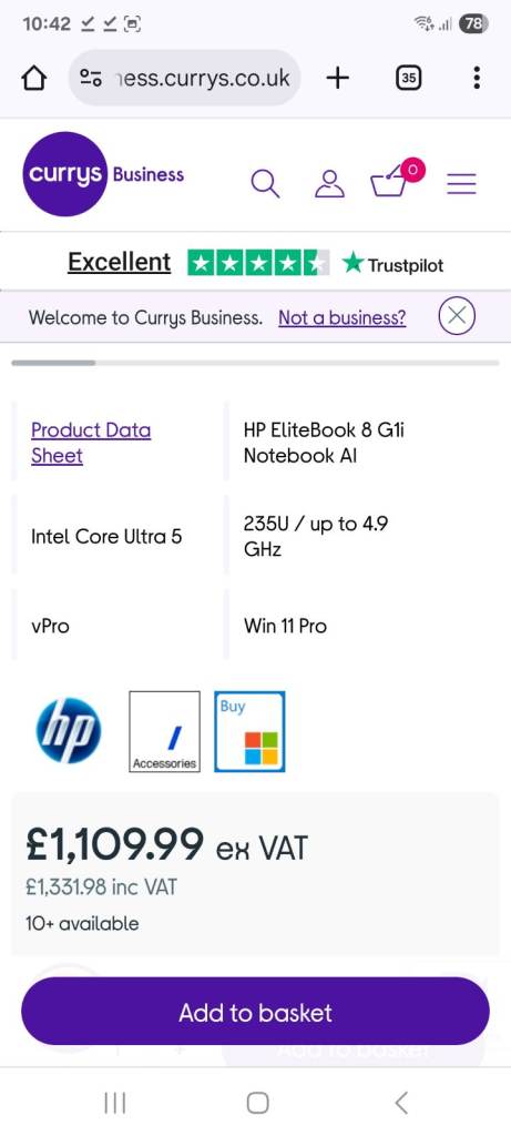 For sale HP EliteBook 8 G1i Notebook AI PC 14 inch business laptop in excellent condition.