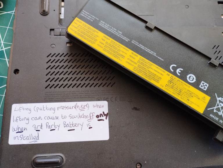 This external battery fitting seems to sometimes contribute to the laptop switching off IF you lift the laptop by putting pressure on part of the base cover with your fingers. Hence - if deciding to use the 2nd external battery simply lift the laptop at the sides. Or to state the obvious - remove/unclick the external battery 🙂.