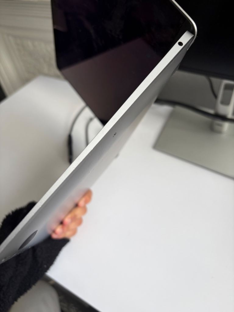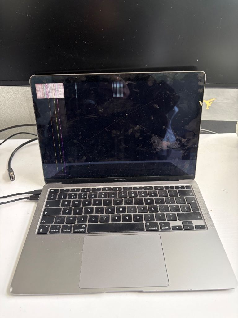 The laptop itself is in good condition. There is a minor chip to the left corner of the laptop and the screen unfortunately does not work but the laptop does power on and function and can be used with an external monitor (see picture).