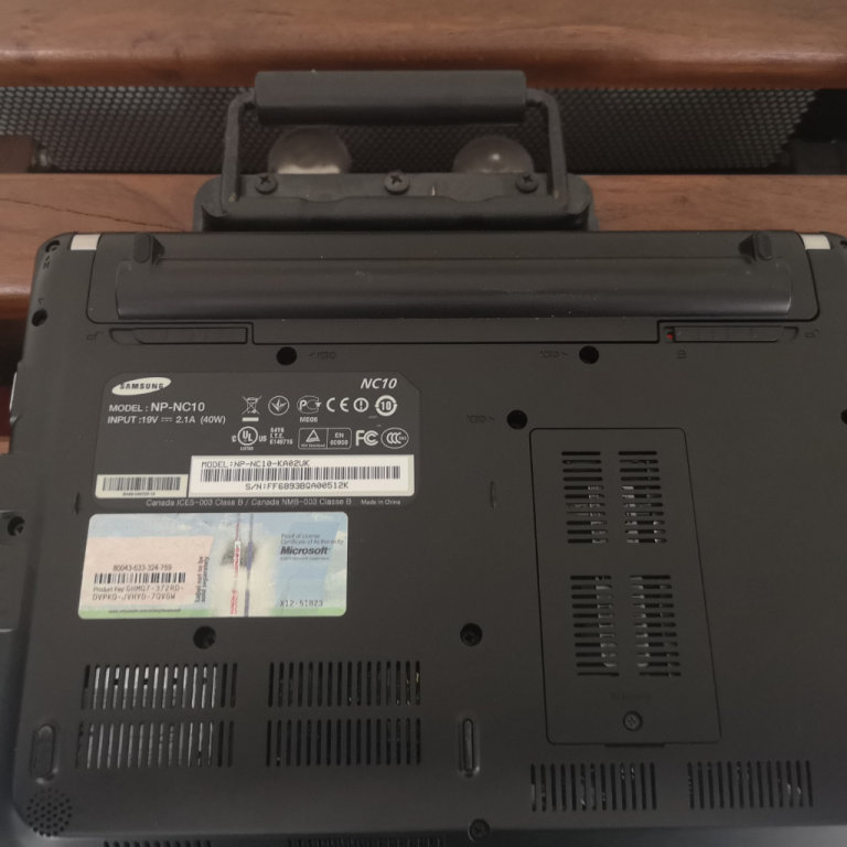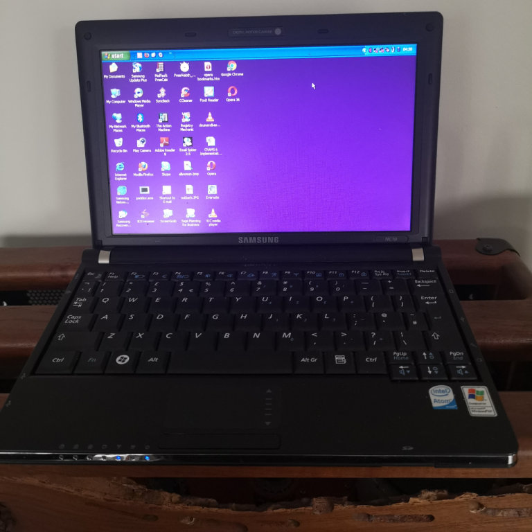 It runs on Windows XP. With a 10 inch Display and Silver Nano Keyboard.