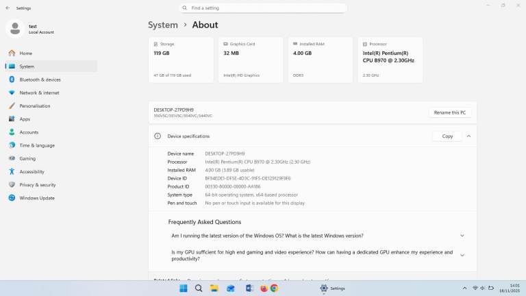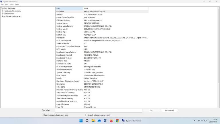 Hardware: Intel Dual Core B970 2.30GHz processor, 128GB SSD drive, 4GB RAM memory, DVD-R/RW rewriter, memory card reader, build in wireless internet WiFi card and wired network card, 4 USB ports (2 are USB 3), HDMI and VGA ports.