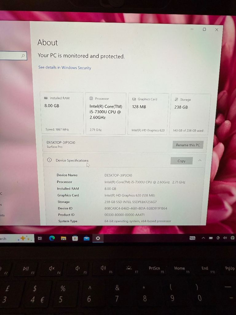 The Microsoft Surface 4 Featuring an Intel Core i5-7300U processor with a speed of 2.60 GHz, 8GB of RAM, and a 256GB SSD, this device offers fast performance and ample storage capacity. With a 12.3-inch screen size and a maximum resolution of 2736 x . stylish silver colour and includes connectivity options such as HDMI, SD card slot, and USB 3.0. Functionality is perfect. No physical damage. Just small damage on keyboard which I sent and a tiny green spot which is totally invisible when working. It has original keyboard, charger and pen.