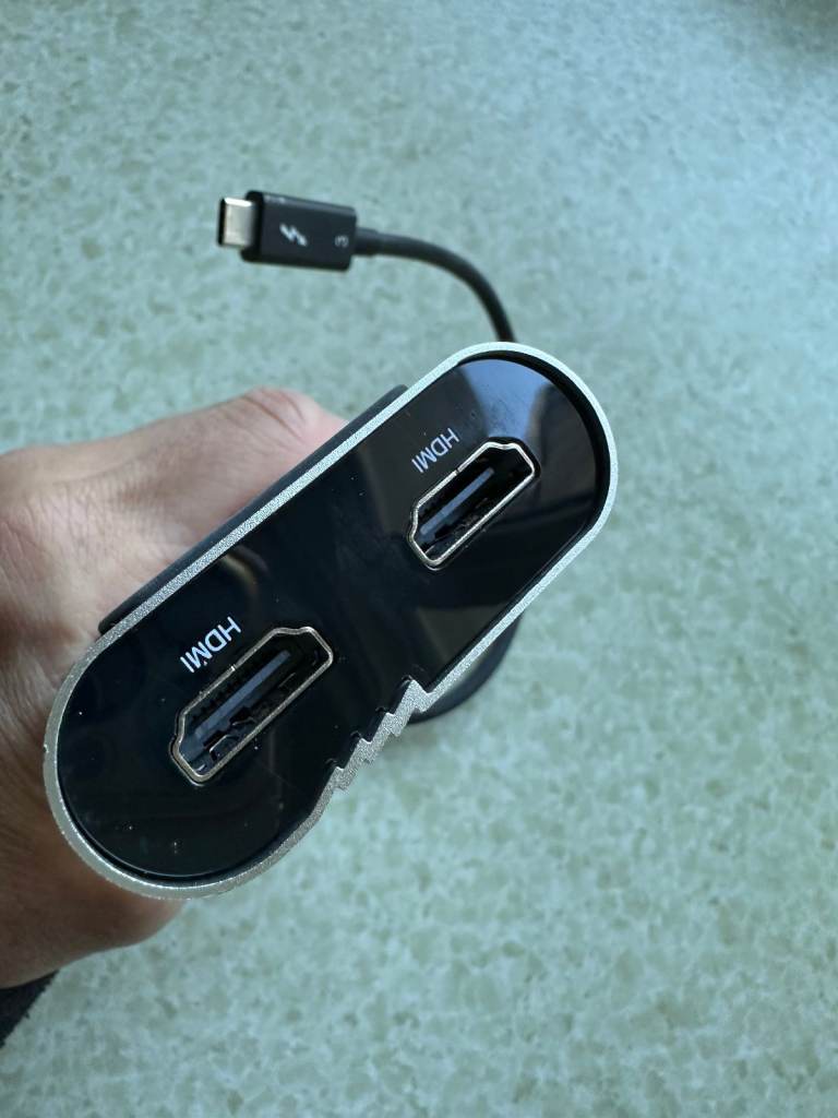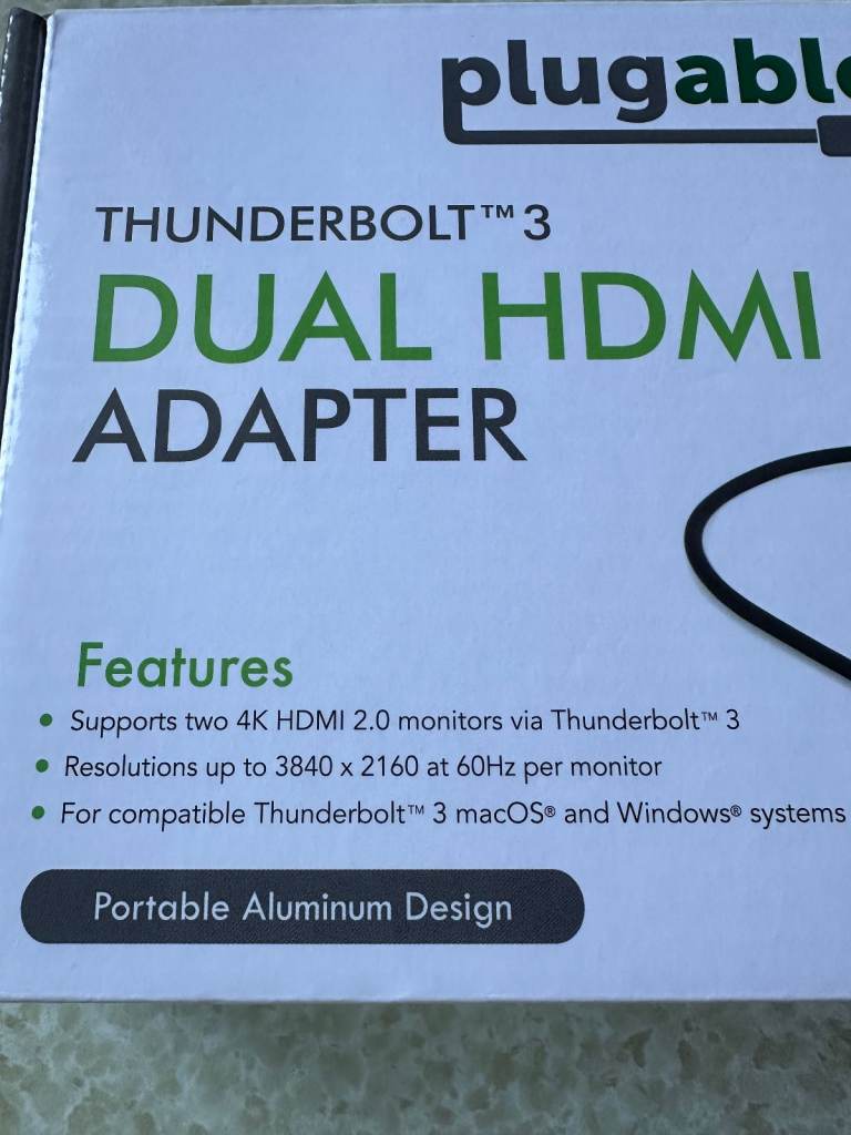 Thunderbolt 3 Dual HDMI adaptor from Plugable. Supports two 4K HDMI 2.0 monitors via Thunderbolt 3. Resolutions up to 3840 x 2160 at 60HZ per monitor. For compatible Thunderbolt 3 MacOS and Windows systems. Full working order & excellent condition with original box. Costs around £90 - £100 new, asking £30.
