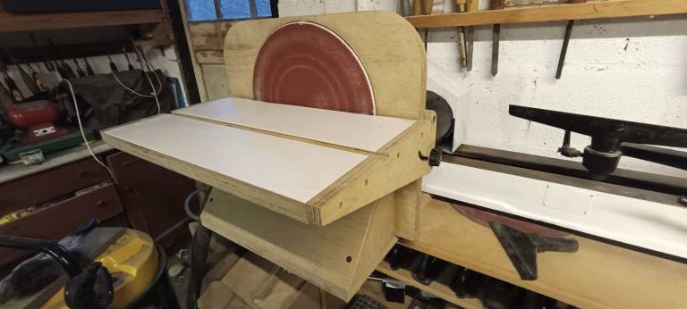 Swivel head long lathe with shop made 12" adjustable disk sander attachment.