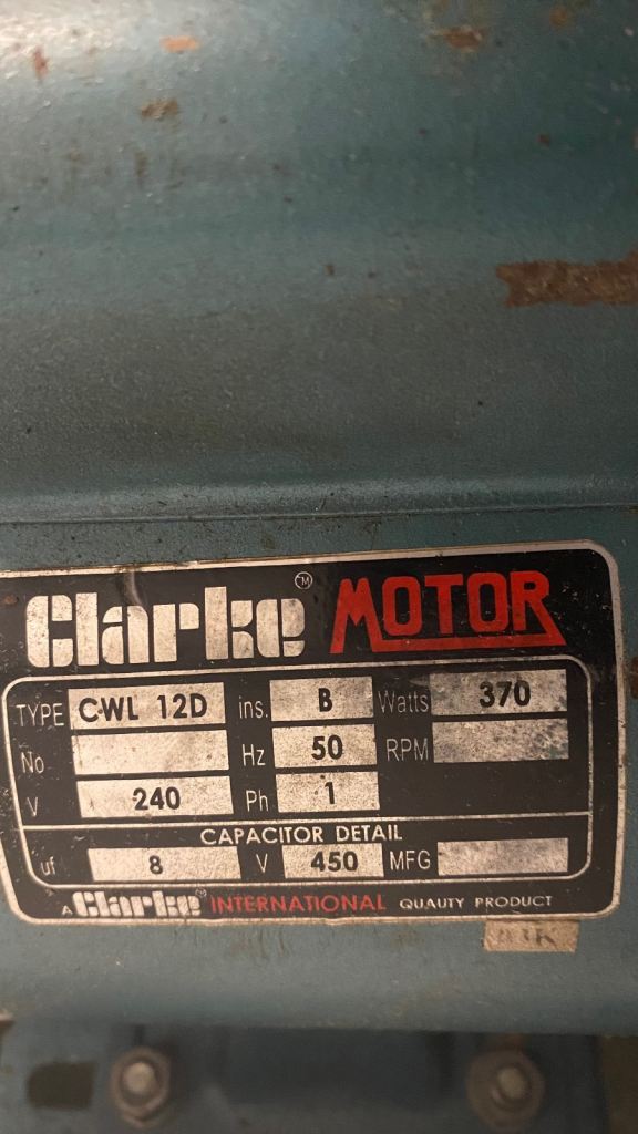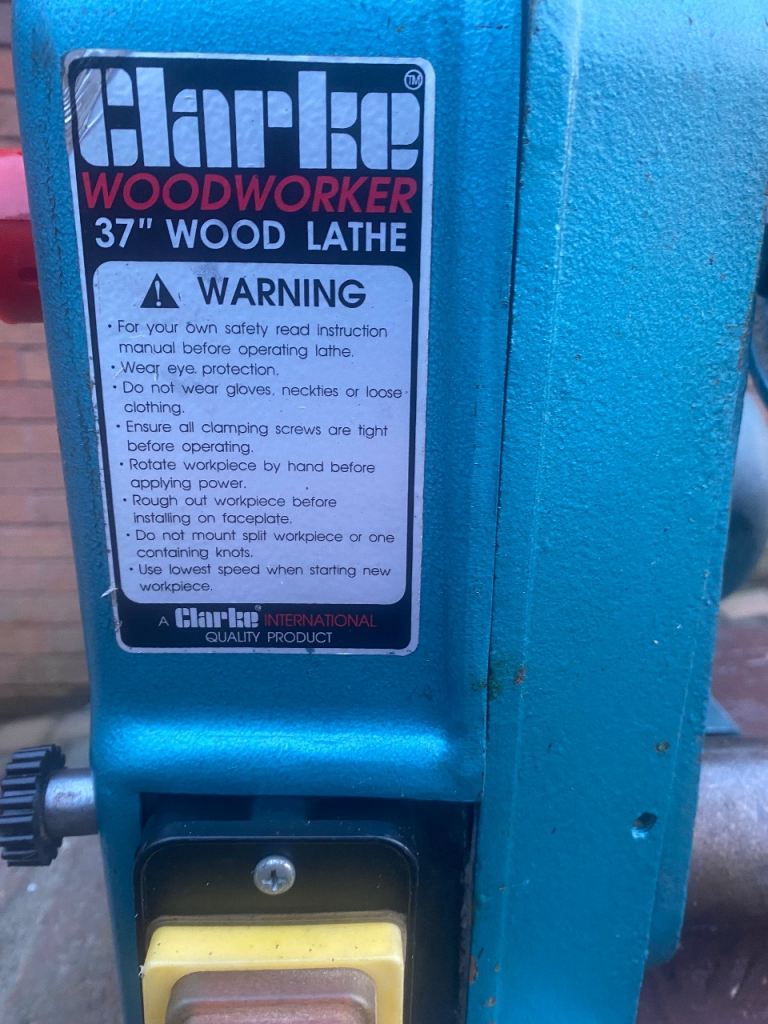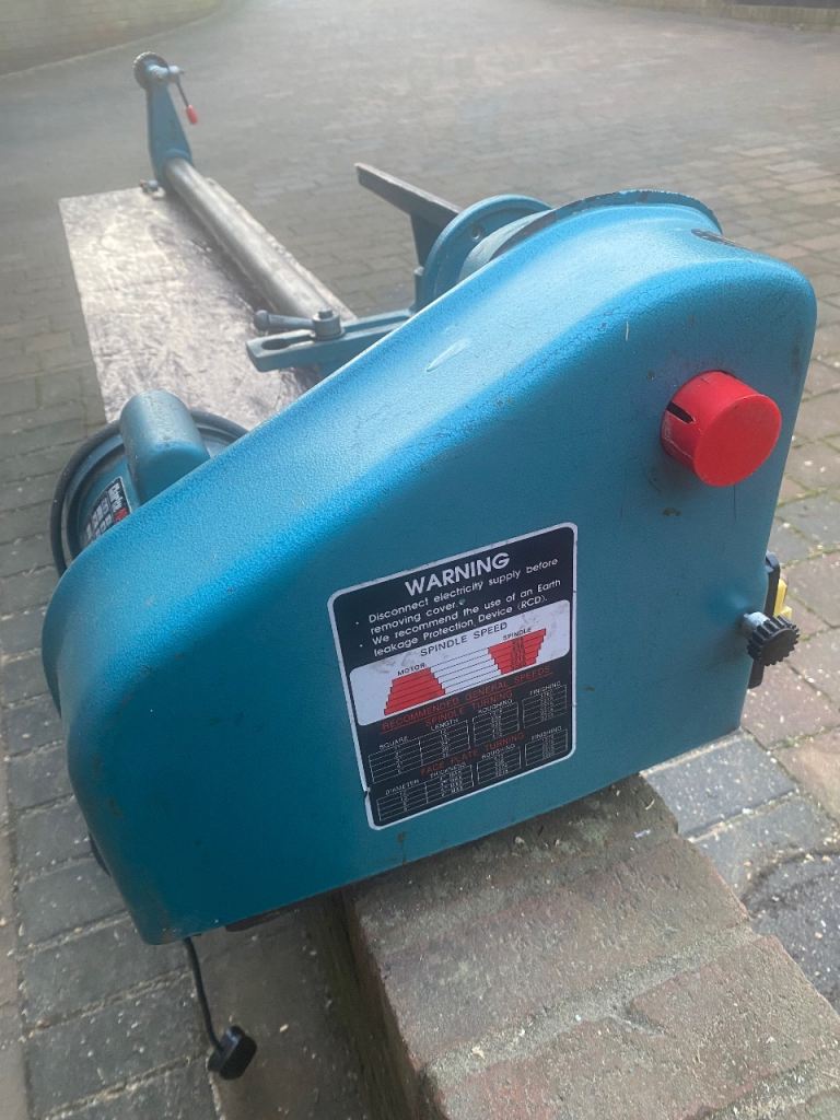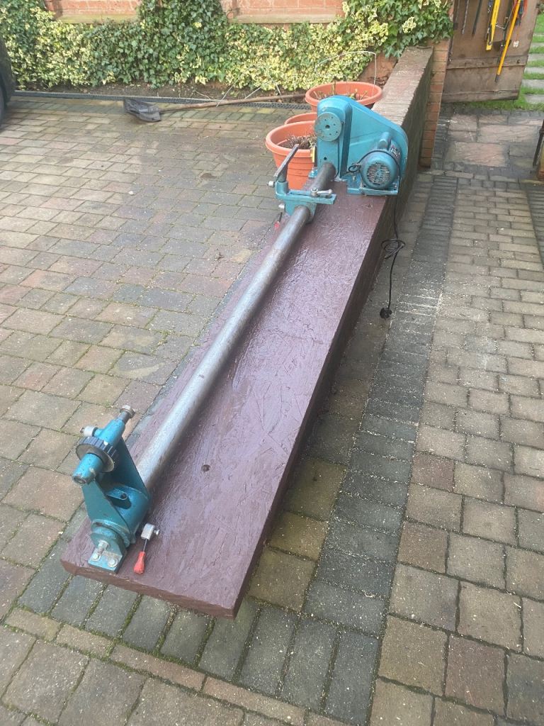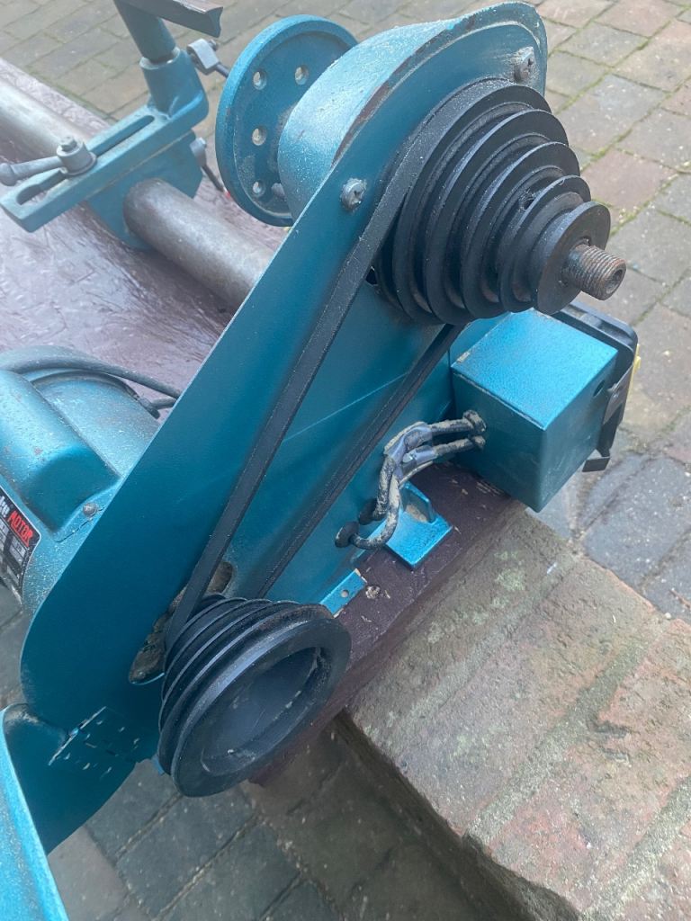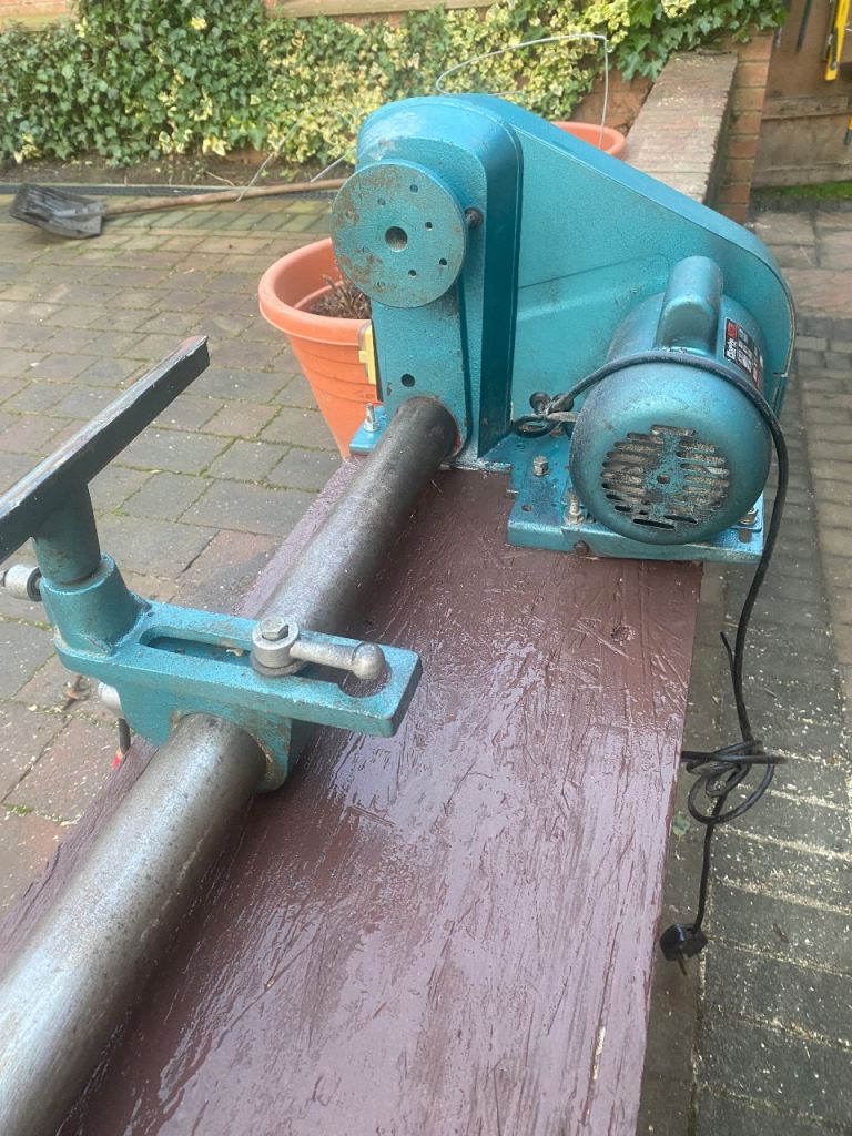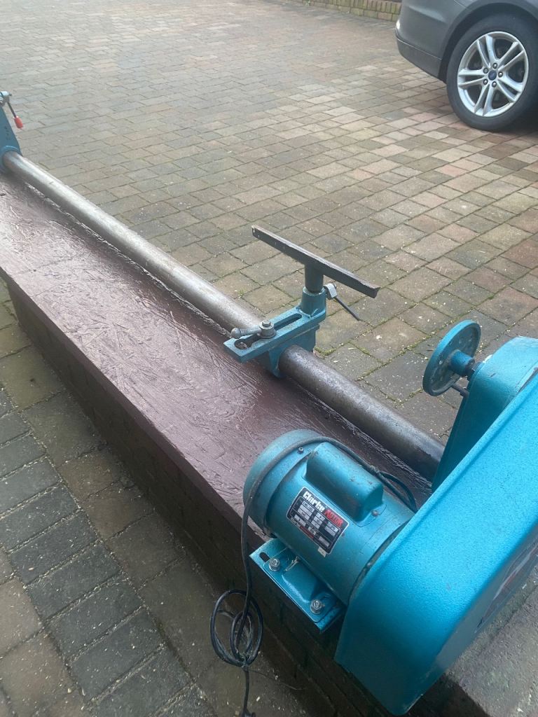 This is a Clarke 370W wood turning lathe in good used condition. The lathe bed has been extended so there is a maximum of 64 inches between centres. It is mounted on a wooden base and the overall length is 79 inches. It can be dismantled to aid transportation.