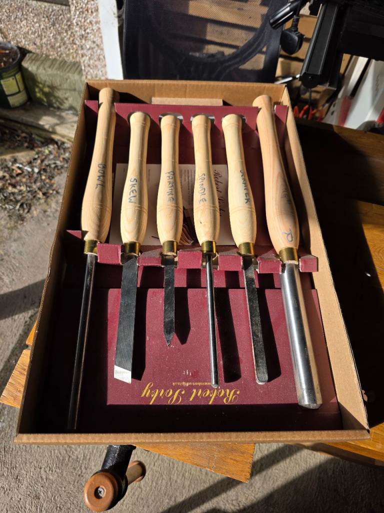 Record Coronet Herald Lathe, with light use. Comes with legs, chuck, jaws, live end and chisels as in photos.