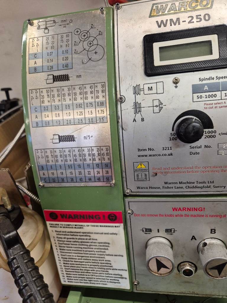 As above in very good condition Used for very small projects Complete with cooling system 3 and 4 jaw chucks taikstock with chuck and centre travelling steady fixed steady face plate and two new sets of cutting tools Two axis digital read out Set of metal thread cutting gears Owners manual Probably some other accessories I've missed