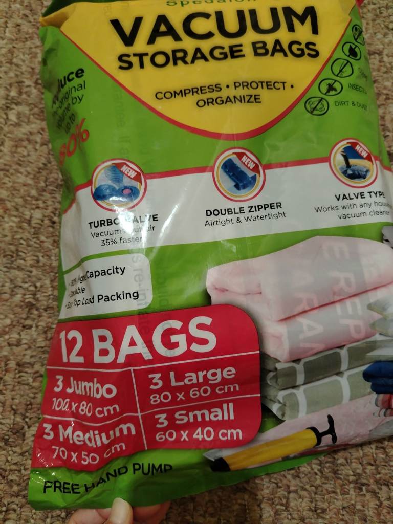 Vacuum Storage Bags - Pack of 12 (3 Jumbo + 3 Large + 3 Medium + 3 Small ) ReUsable with free Hand Pump for travel packing | Best Sealer Bags for Clothes, Duvets, Bedding, Pillows, Blankets, Curtains