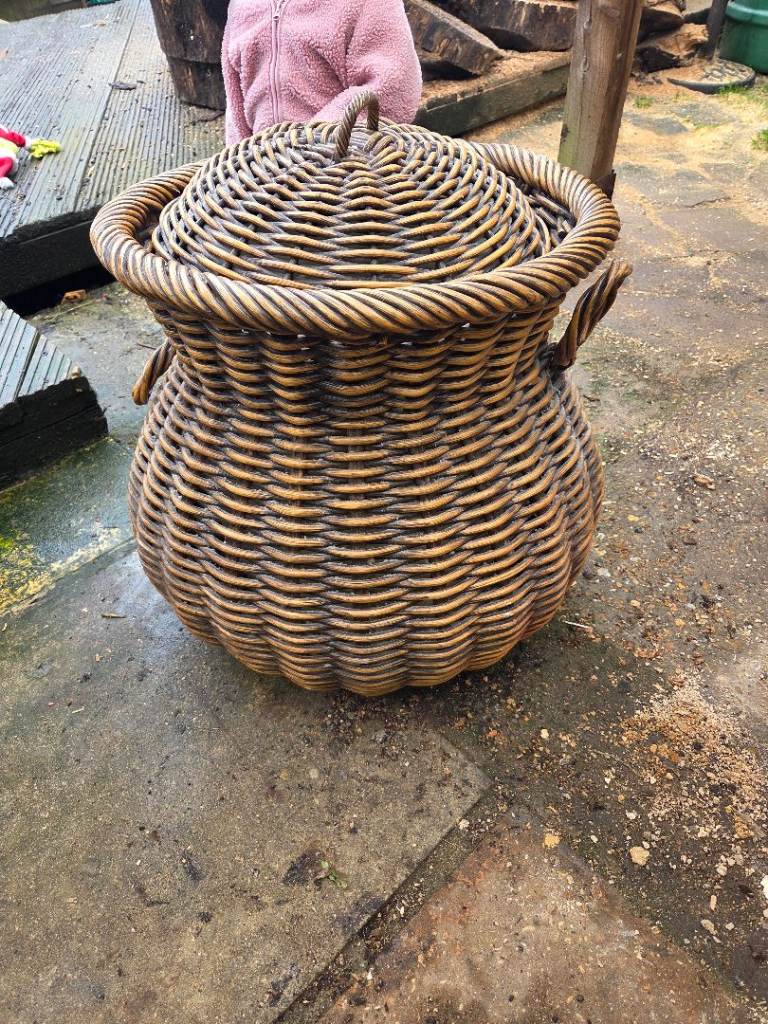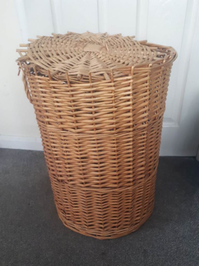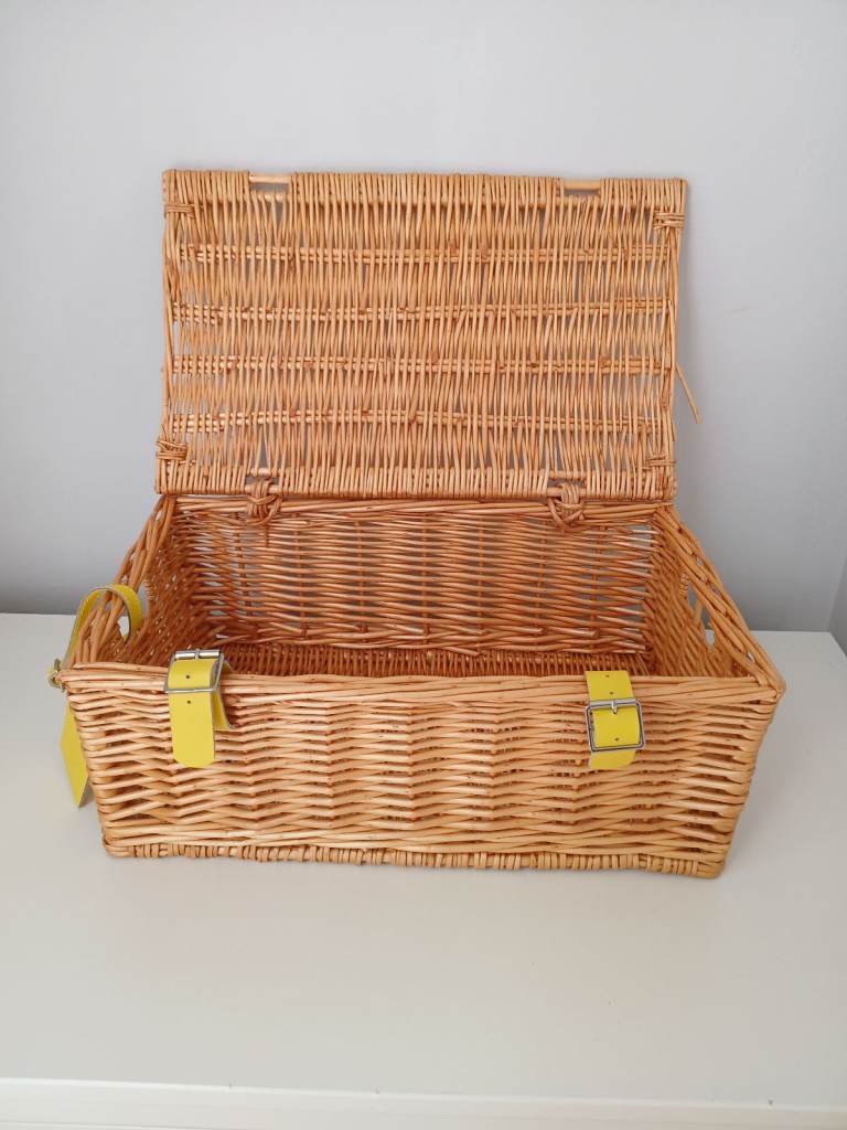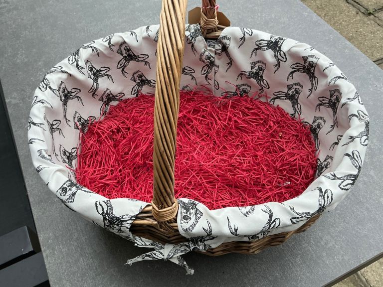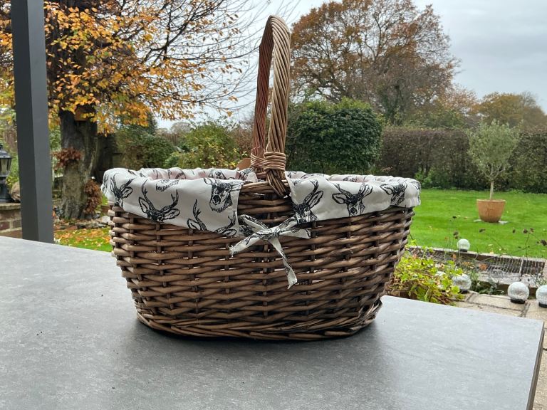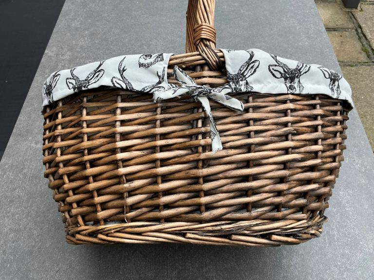 Well made wicker basket, lined with grey and white deer pattern cotton. In clean perfect condition. Large oval shape, with handle, measures 44cm long and 34cm across. Complete with brown paper label, ready to pack with goodies for a perfect Christmas present!